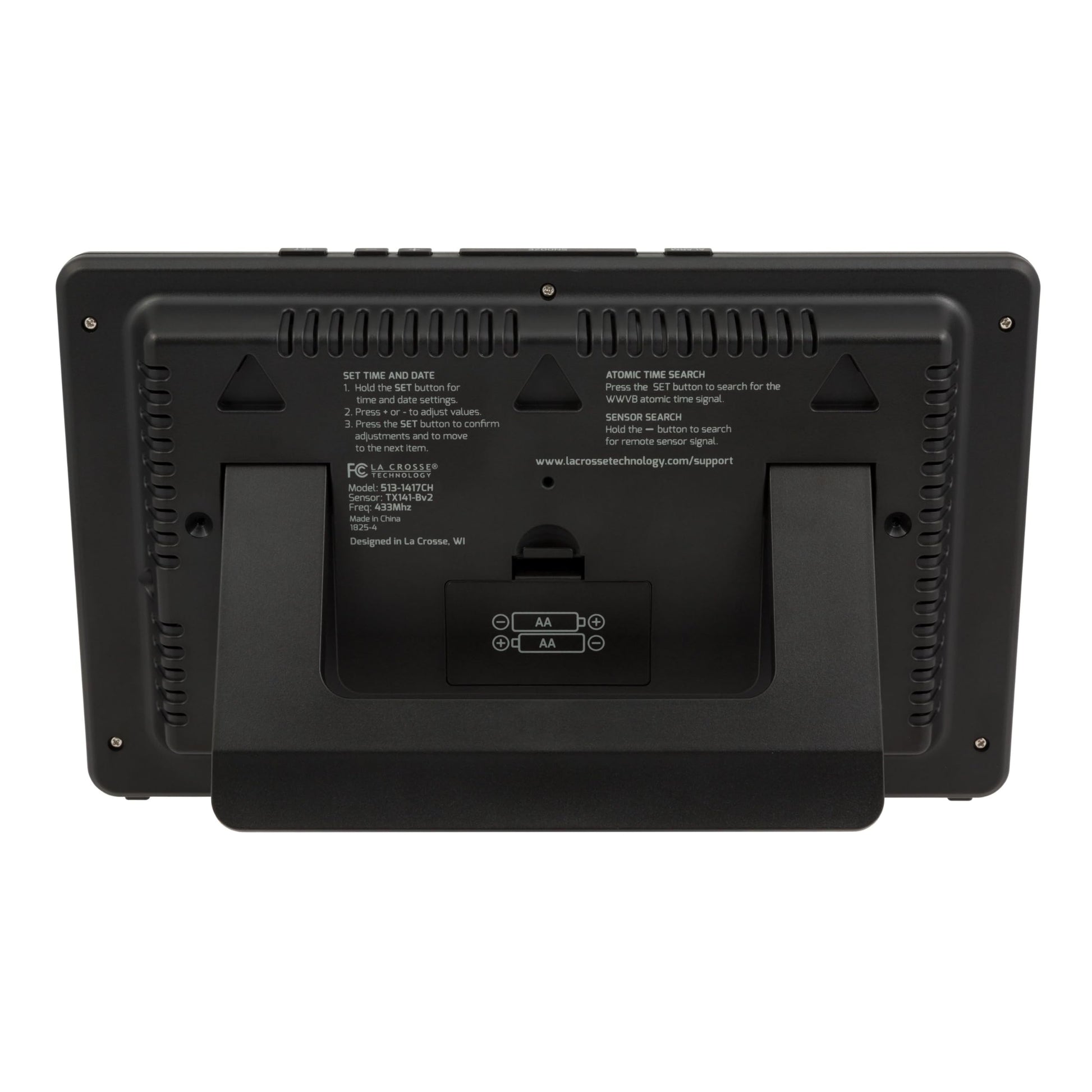 - This digital atomic wall/table clock features a classic black and brown finish. Includes a built-in stand for a table-top display and a wireless sensor to read and signal the outside temperature. Setup available in English and Spanish.