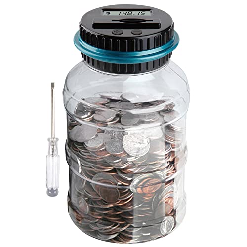 - š°ćDesigned For All US CoinsćLarge capacity up to 1.8L, digital counting money jar can storage 800-1000 coins. The digital counting coin bank accepts all US coins and is powered by 2 AAA batteries(Not Included).