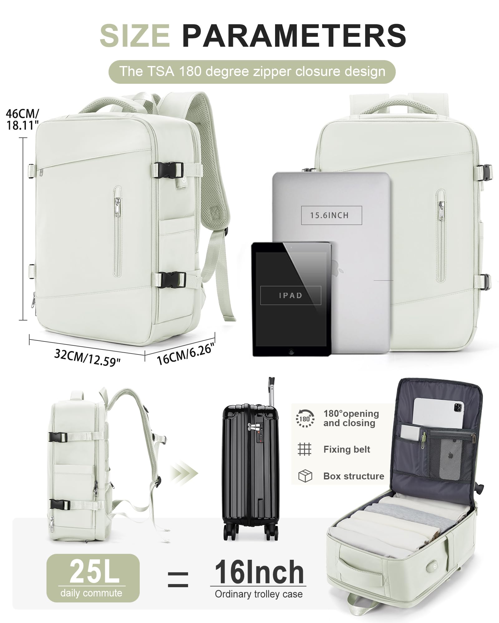 Large Travel Backpack for Women Carry On Airline Flight Approved Expandable Work Personal Item size Backpack Bag with Laptop compartment for College Men Waterproof Hiking Mochila de Viaje MoonWhite