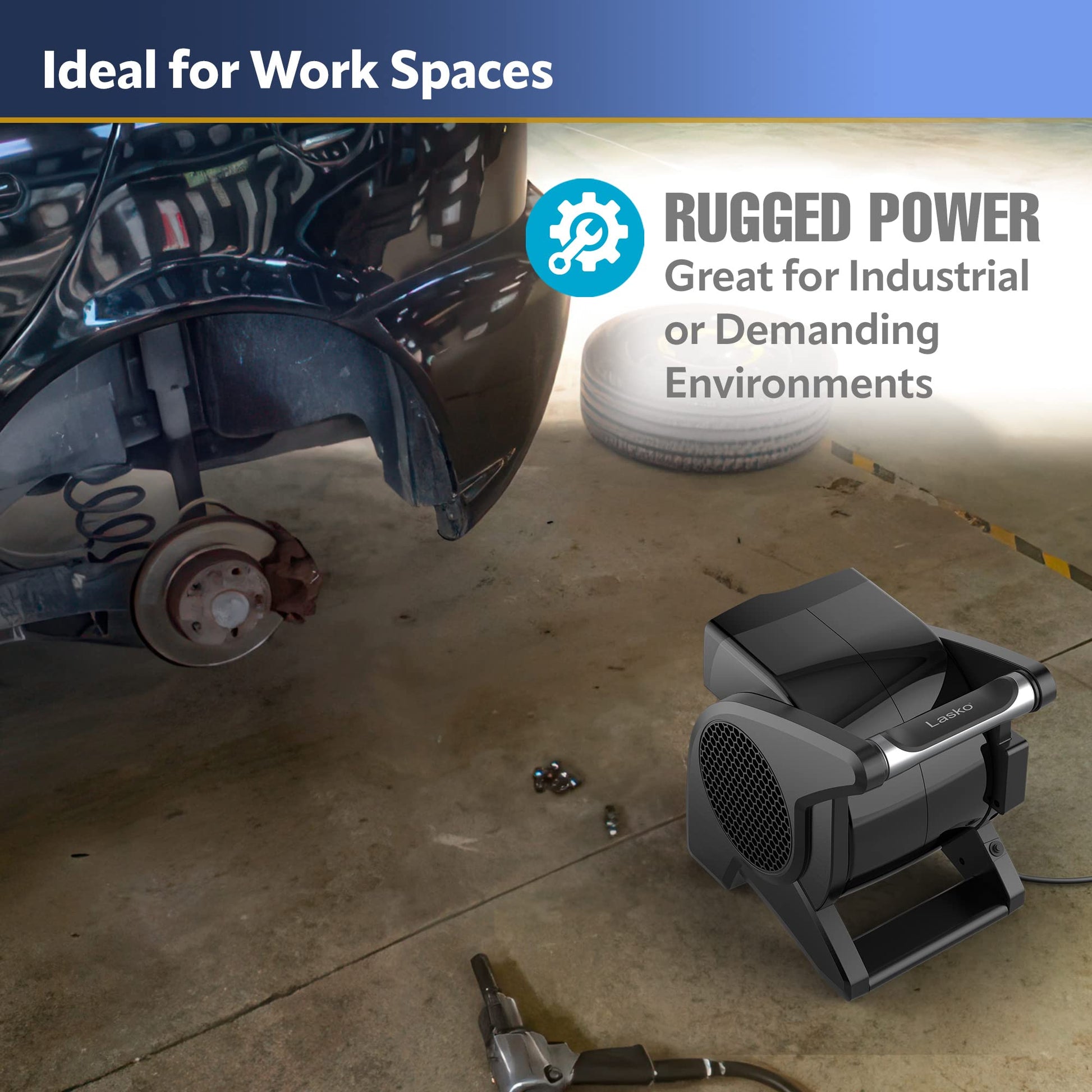 Details: Get the job done with the Pro-Performance Pivoting Utility Fan by Lasko. This rugged fan is constructed with 3 high velocity speeds and provides a powerful air stream for cooling, ventilating, exhausting, and drying. The pivoting fan blower can be pointed in a full variety of directions from the floor to the ceiling. Includes two 120-volt accessory outlets, a safety circuit breaker with reset button, and a 10-foot cord with a 3-prong, grounded plug. Features an easy-grip handle and comes fully assembled. 1-year limited warranty.