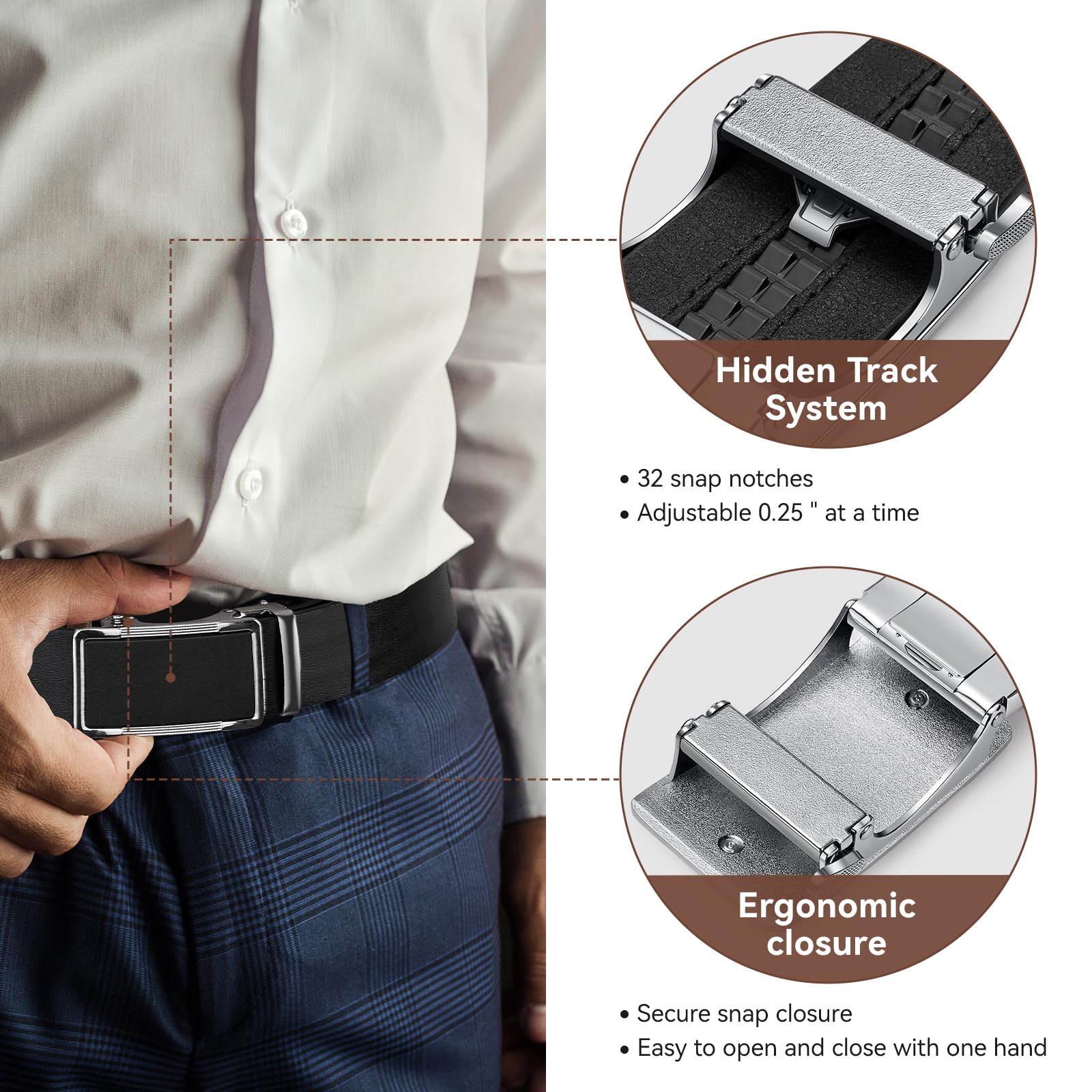 - Classic Black Color Design: The polished and frosted design of these ratchet belts makes them a great closet accessory. Wear this men's black belt with a variety of outfits, from formal business attire to casual weekend looks, our men's belts are perfect for your on-the-go decorating needs.