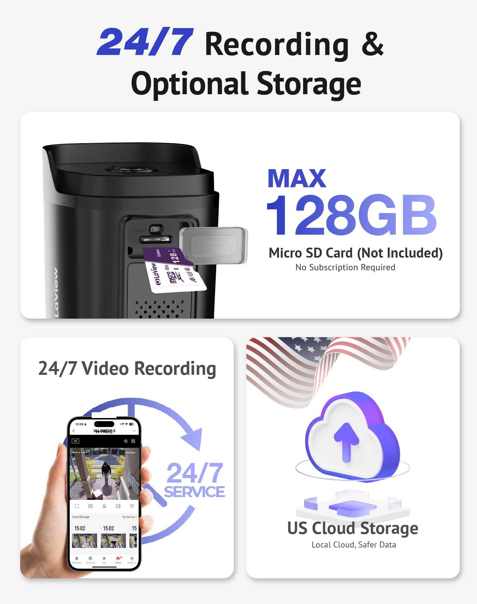 - US Cloud Storage & IP65 Waterproof: Built-in micro SD slot for up to 128GB SD cards; supports secure cloud storage; operates in temperatures from 14 F to 122 F; waterproof and durable against bad weather