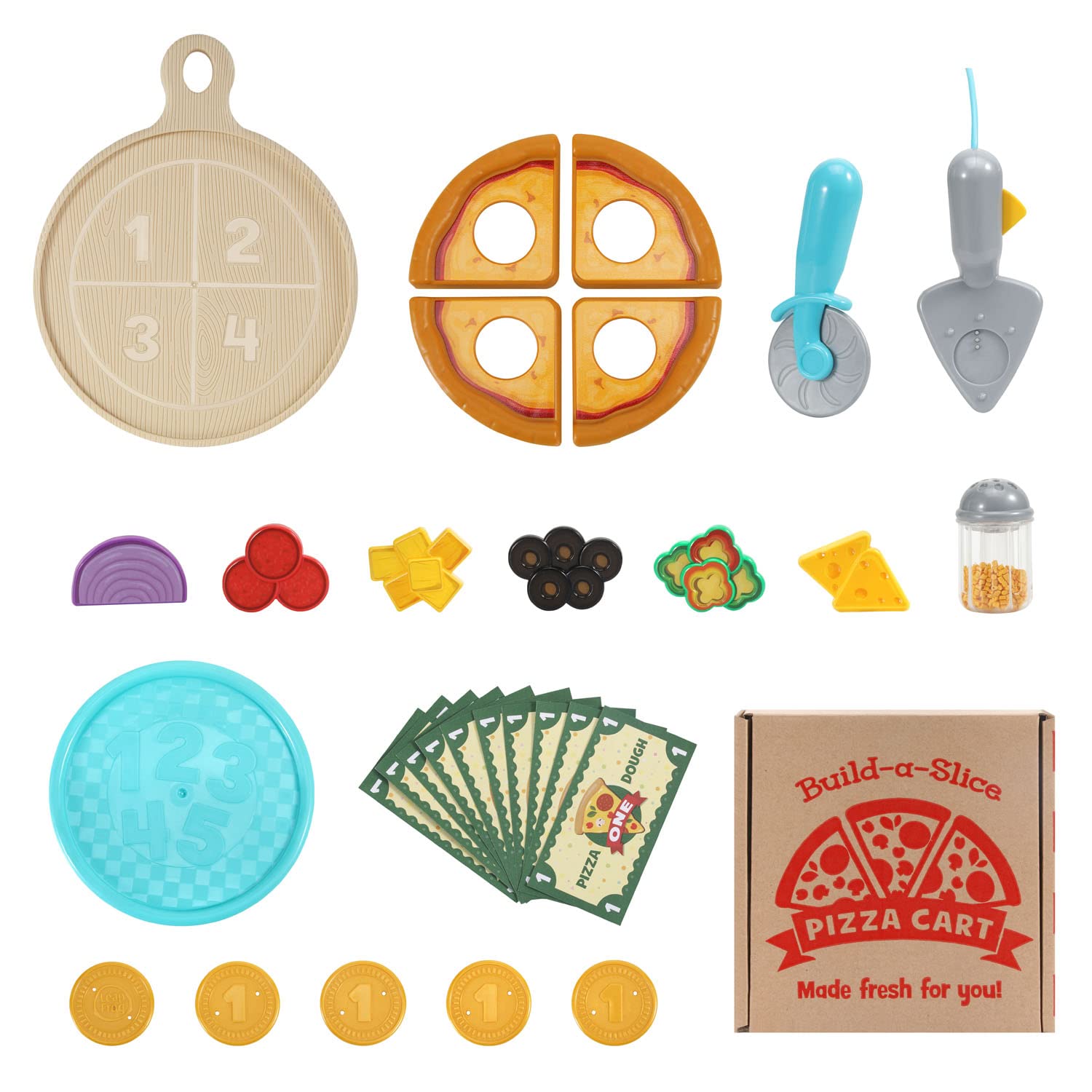 • Open a pizza food cart with everything tiny pretend business owners need including six toppings, a pizza cutter, plate, cheese shaker and more