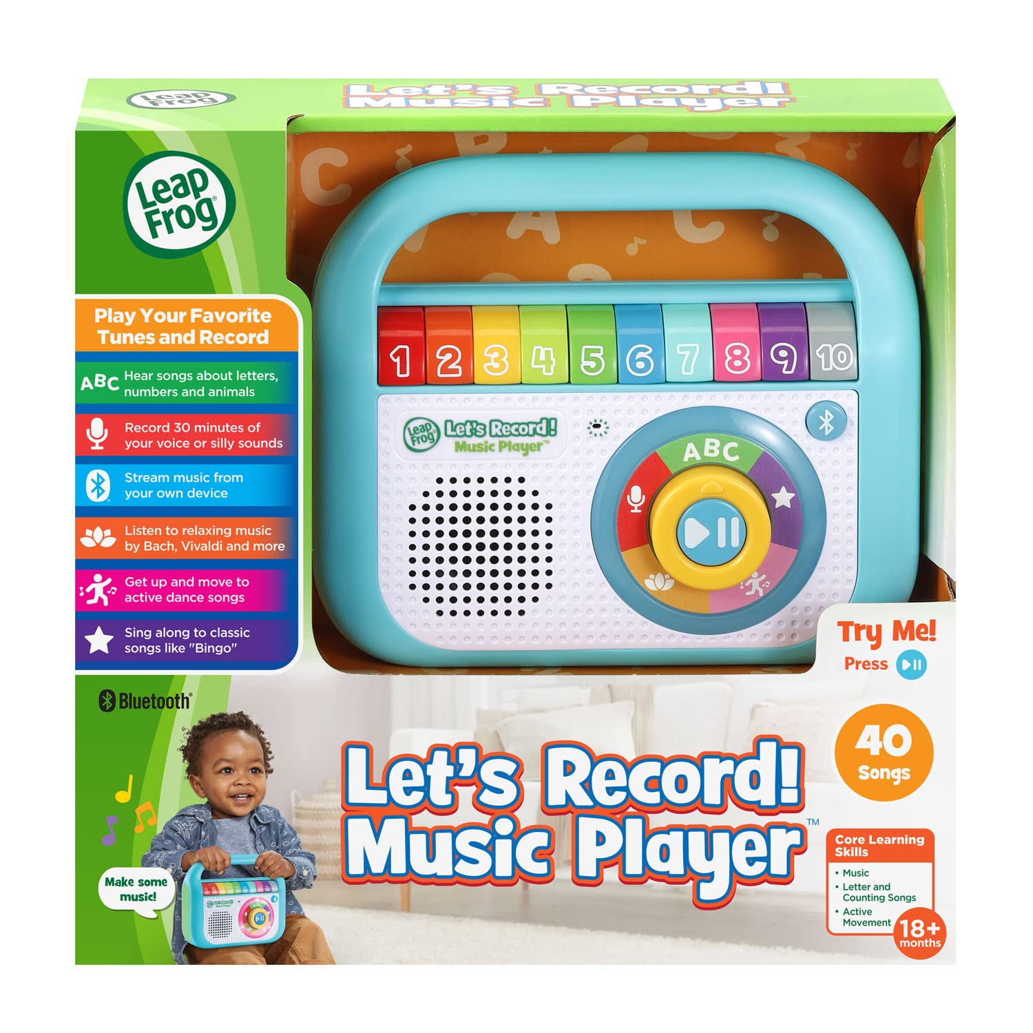 Details: Turn on the tunes and play up the learning with the Let's Record! Music Player. Your budding singer can record up to thirty minutes of their voice or silly sounds! Ten learning songs teach kids about letters, counting, animals, the weather and more. When it's time to get up and get active, switch to 10 energetic songs like "If You're Happy and You Know It"! Encourage kids to sing along to 10 classic favorites like "Twinkle, Twinkle, Little Star," then relax with 10 lullabies and classical music pieces like Beethoven’s "Ode to Joy." With Bluetooth wireless technology, adults can stream music from their own devices to add songs and soundscapes to the included 40 songs. Introduce your favorite toddlers and preschoolers to a world of music and learning! Intended for ages 18+ months. Requires 4 AA batteries. Batteries included for demo purposes only. New batteries recommended for regular use.
