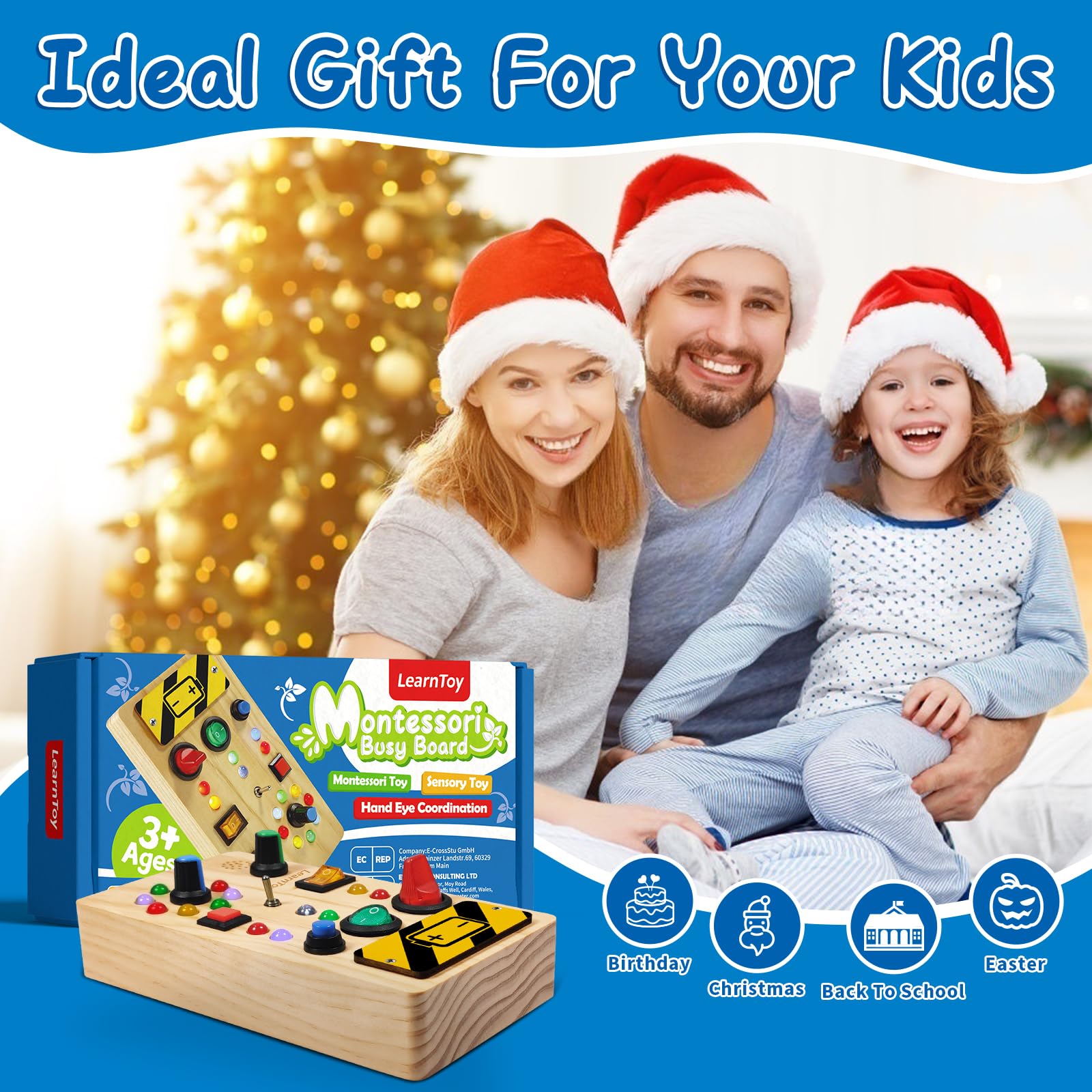 LearnToy Montessori Wooden Busy Board for Toddlers 1-3 Years - Sensory Learning Toy with LED Light Switches & Trumpet Horn - Portable Travel Activity Board for Baby Development