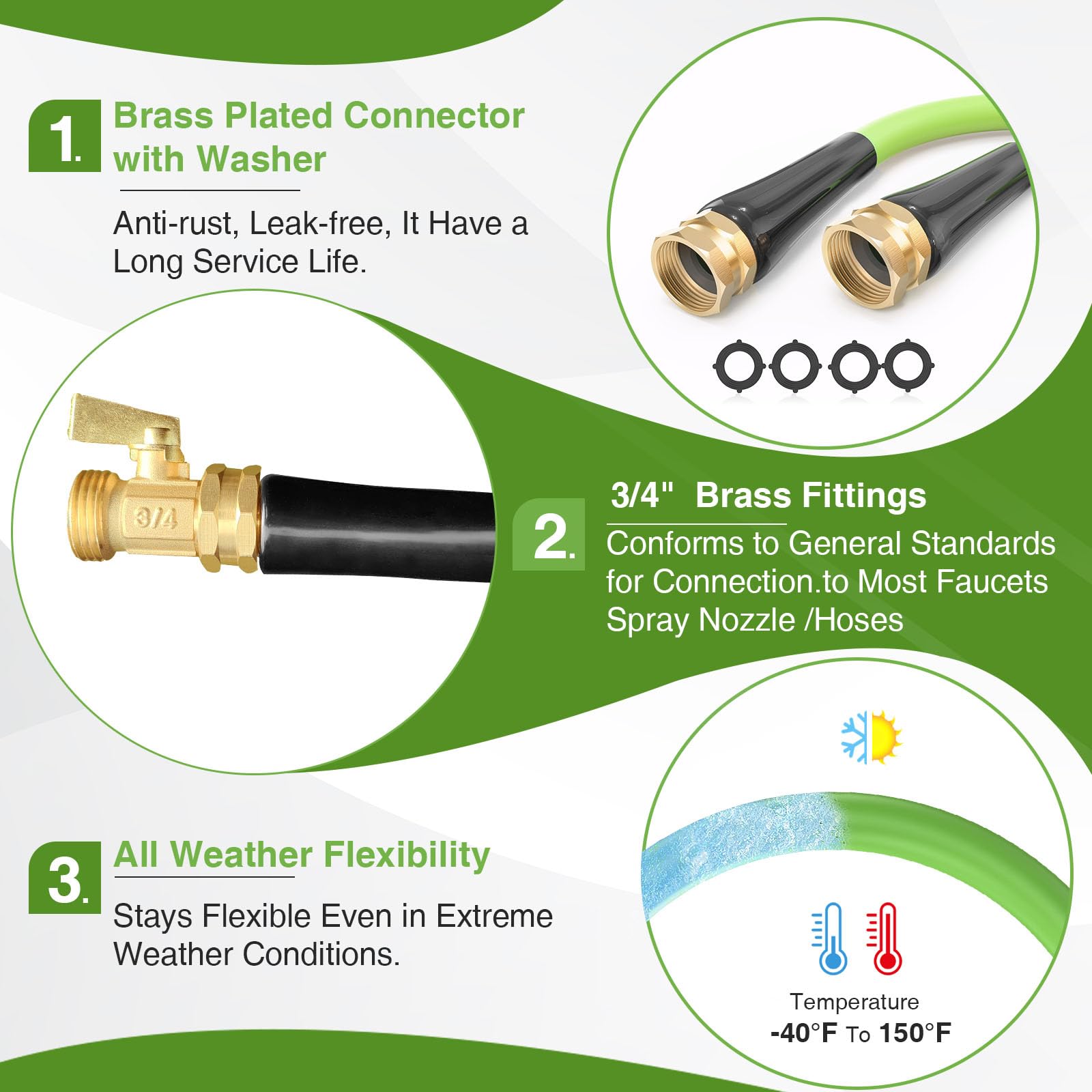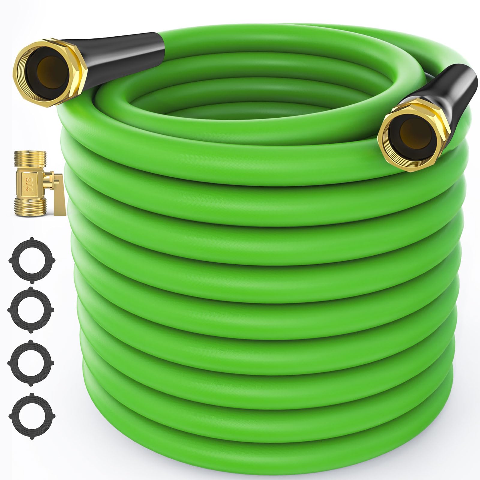 - EXTRA REMOVABLE VALVES: Garden hose is paired with 3/4-inch removable brass shut-off valve, which can be connected to typical outdoor garden faucets, nozzles, sunbathers, and hose reels in the U.S.A., effectively preventing connection leaks.