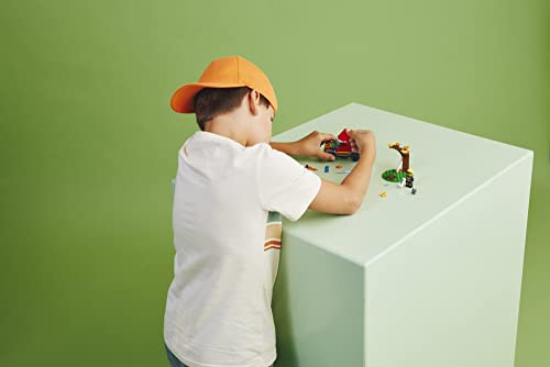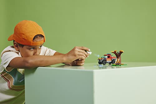 - Children can jump into their toy LEGO off roader vehicle, run to put out the campfire and be ready to save the cat stuck up the toy tree!