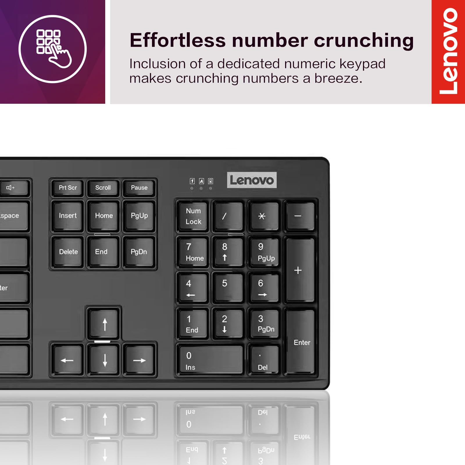 Details: Say goodbye to clutter and hello to streamlined efficiency. The Lenovo 100 keyboard's compact size is tailor-made for modern workspaces. Easily stow it away in lockers or desk drawers when it's not in use, effortlessly optimizing your workspace and promoting an organized atmosphere. Unlock your true potential with enhanced productivity at your fingertips. The keyboard's Fn keys come armed with shortcut functions, strategically positioned for quick and intuitive access. Seamlessly navigate through tasks, applications, and commands with ease, allowing you to stay focused and in control throughout your workday. But that's not all – we understand the importance of numerical tasks in your workflow. The Lenovo 300 doesn't just stop at typing; it empowers your number-crunching endeavors. With a dedicated numeric keypad right at your fingertips, you'll breeze through calculations, data entry, and spreadsheets like never before. Efficiency meets precision in a way that only this keyboard can deliver.