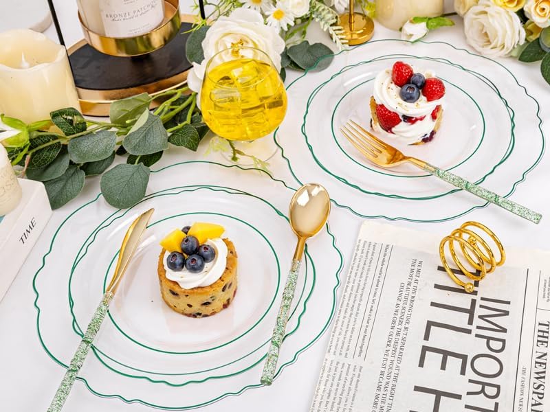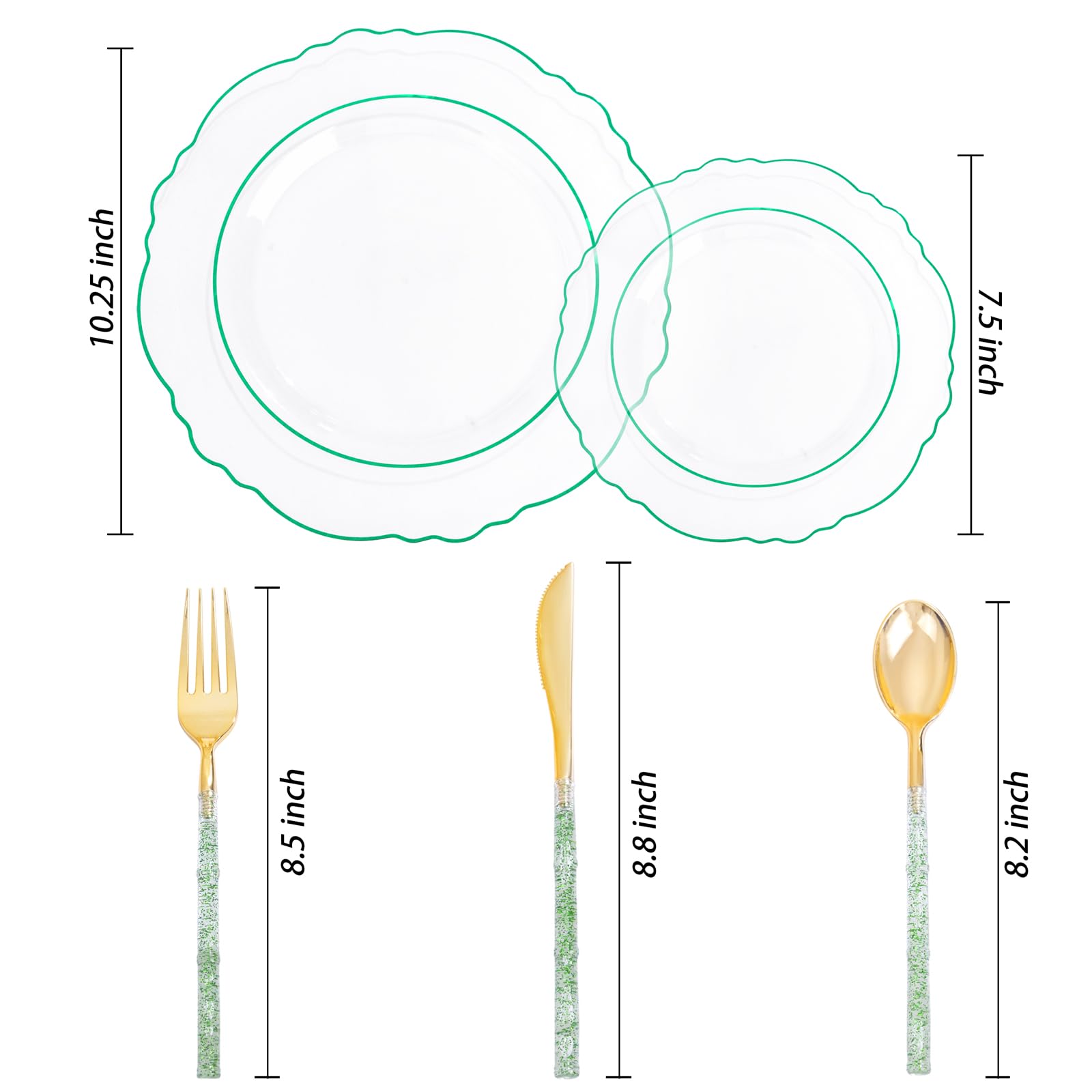 - PERFECT FOR ANY OCCASION :Whether Weddings, Birthdays, picnics, Christmas or family gatherings,our green disposable dinnerware set elevates your event.Lightweight and elegant, the clear and green plastic plates are both convenient and beautiful for a hassle-free celebration!