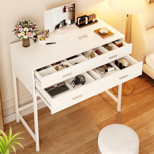 - Desk with Double-deck 3 Drawers: Three storage drawers provide ample space to meet your storage needs, let you using your desktop space more freely. The upper-deck drawer is a large and flat drawer for storing cosmetics, jewelry. The lower-deck drawers are two deep drawers for you to store books and other daily necessities