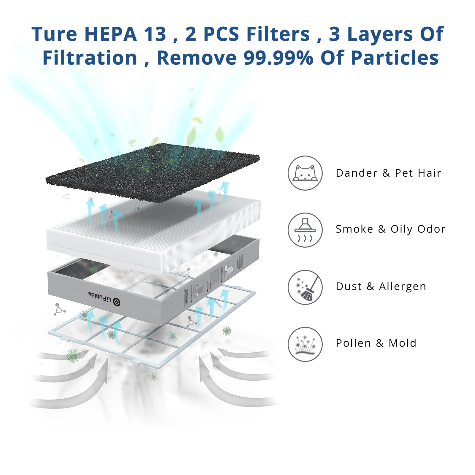 - 【TRUE HEPA H13】lt is proven and certified by 3rd party testing labs to remove and capture 99.99% of all airborne particlesdown to 0.01microns, preventing pollen, dust, pet skin Chips, wildfire smoke,3 layers of filtering