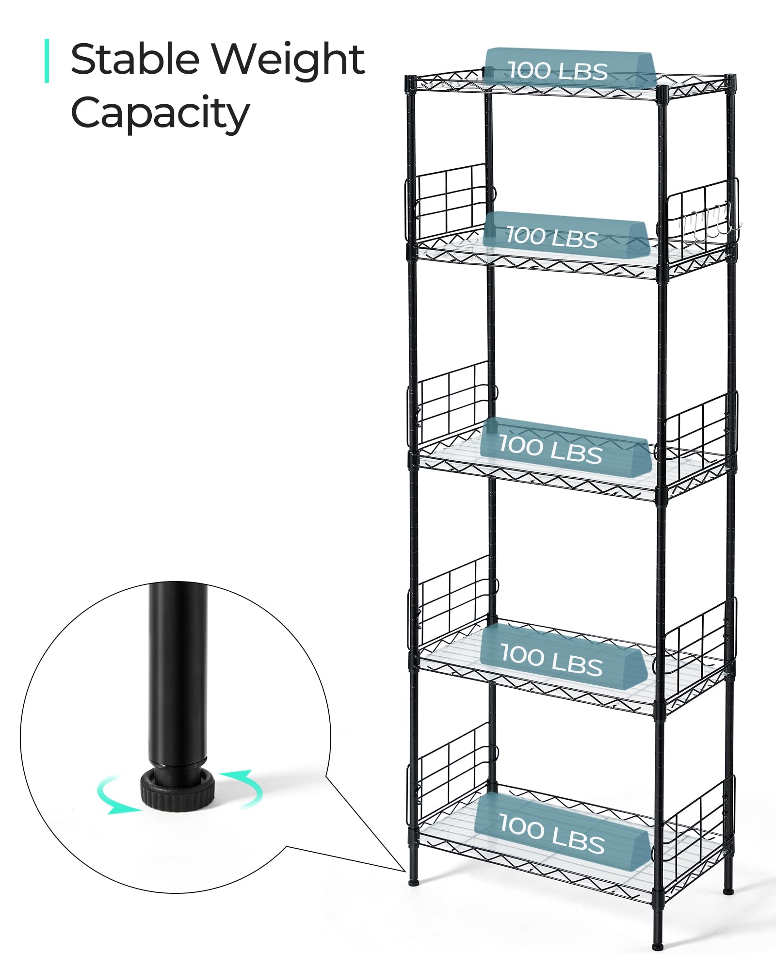 - Heavy-Duty Metal Shelves for Storage - Constructed with heavy-duty painted metal, make the shelves for storage anti-shake and rust-resistant. Each shelf holds up to 100 lbs, with a total sturdy weight capacity of 500 lbs