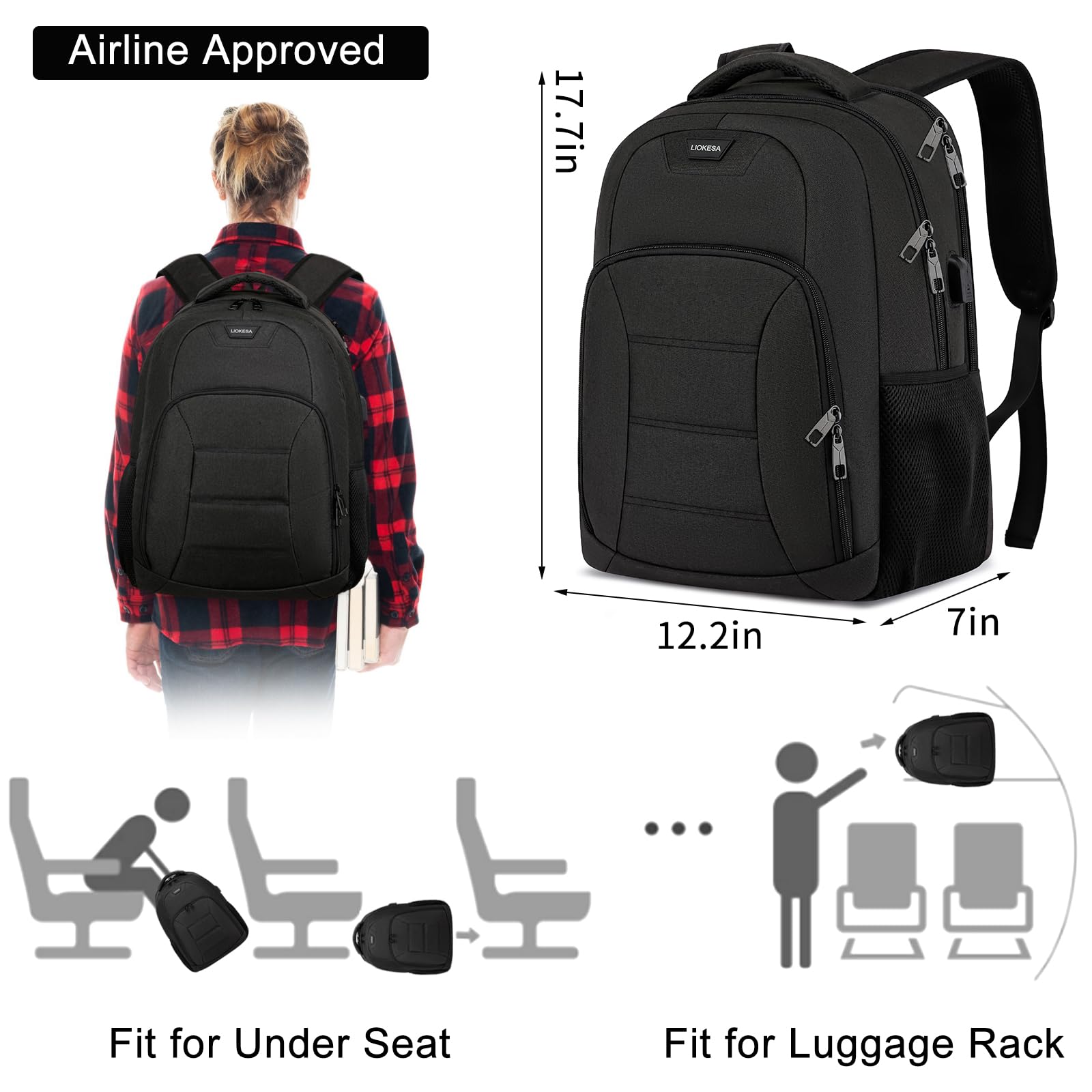 - LARGE CAPACITY - The size of LIOKESA black backpack for men is 17.7 * 12.2 * 8.3 inches, 30L. The laptop backpack has 4 compartments and 2 side pockets - 1 15.6-inch padded laptop compartment. There is a main compartment inside for storing folders, books, clothes, and other work supplies. 2 front pockets can hold pens, sunglasses, chargers and keys. Travel backpack keeps everything in order.