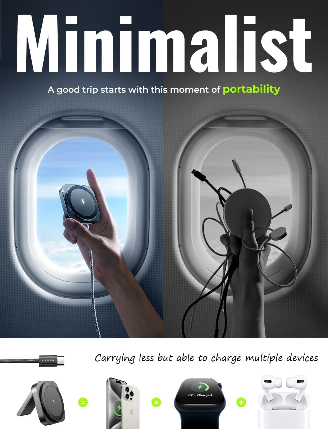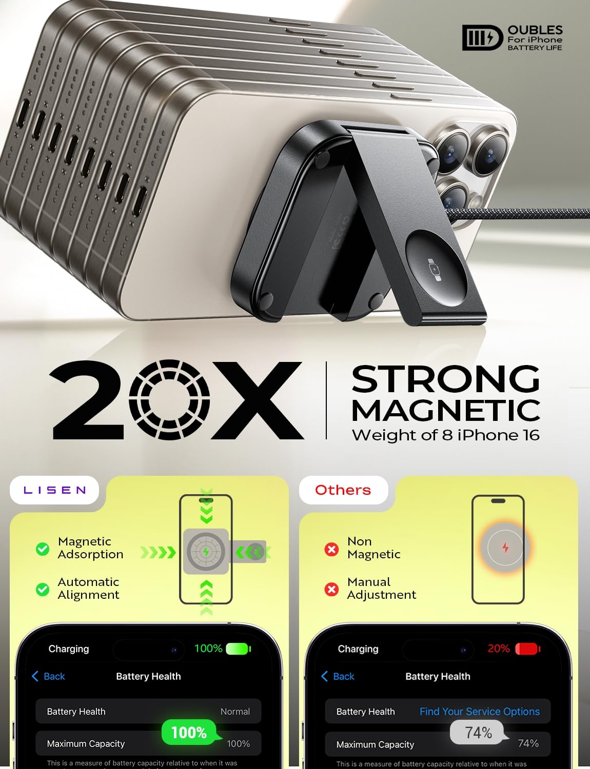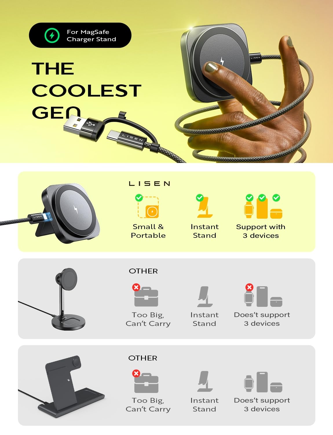 - 0.3" Ultra Slim 2-in-1 Upgrade 3 Devices for Apple Magsafe charger Stand. - Introducing LISEN Minimalist Magic for Mag safe charger, the game-changing upgrade from cumbersome 3 in 1 charging station apple. This incredible upgrade is not just more convenient — it's a whole new level of ease slim. Imagine a slim design that's 100% more convenient than traditional 3-in-1 chargers. After all 90% of the time, you only need to recharge for two Apple devices at the same time!