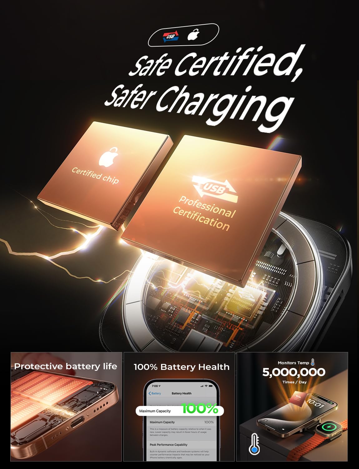 - [International Patent for The Safety of Charging Devices] Charge for iPhone 16 15 pro Max 14/13/12 series with seamless magnetic alignment via for Apple iPhone MagSafe charger. After charging 100% at night, it automatically stops charging and provides the healthiest protection for the batteries of multiple devices. Reduce damage to iPhone from frequent use of the charging socket. The iphone magnetic charger has over-temperature, over-current, over-voltage and short-circuit protection, providing you with safe charging protection