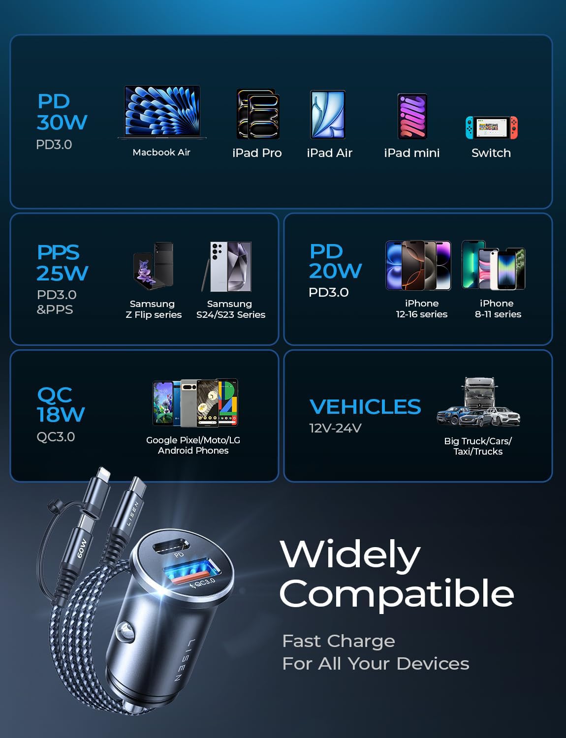 - Super Fast PD Charging: Super fast car charger USB C with all-new upgrade PD36W can charge iPhone 16/15/14/13/12 series up to 90% and ipad up to 70% at 35mins. And it also support SAMSUNG PPS super fast charging for S22/21/20