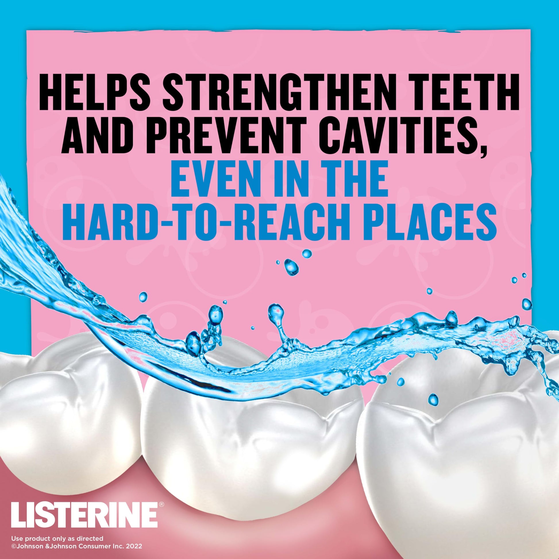 Details: Help protect and strengthen your child's teeth with Listerine Smart Rinse Bubble Blast Kids Anticavity Mouthwash. For children six years and older, this ADA-Accepted children's mouthwash provides oral care for kids by helping strengthen teeth, cleaning the mouth beyond brushing alone, and preventing dental cavities - even in hard-to-reach places. In a lab study, this alcohol-free mouthwash with sodium fluoride and acidulated phosphate offered two times stronger teeth for better cavity protection with brushing. The kids' oral rinse also freshens breath by killing 99% of bad breath germs and tints food particles and debris so kids can see immediate proof in the sink of a cleaner mouth. To encourage good daily oral hygiene habits, the anticavity mouthwash has a fun Bubble Blast flavor designed for kids. To use, vigorously rinse with two teaspoons of the kids mouthwash for one minute, twice a day.