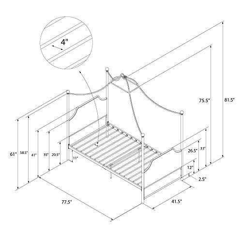 Details: When the time has come to consider big girl beds for your growing little princess, let the Little Seeds Monarch Hill Clementine Gold Metal Twin Canopy Bed be your ultimate choice. With its sturdy gold-coated metal canopy bed frame and white linen upholstered head and footboards, the Monarch Hill Clementine Gold Metal Twin Canopy Bed will become the elegant focal piece of your little royals bedroom for years to come. The gold metal sides of the canopy bedframe offer stability, while a center gold metal rail adds additional support, giving your little one a safe and beautiful place to rest her royal head at night. The Little Seeds Monarch Hill Clementine Gold Metal Canopy Bed fits a standard twin size mattress (sold separately), no box spring or additional foundation required. Little Seeds not only creates this and many more on trend kids furniture pieces, we also partner with the National Wildlife Federations Garden for Wildlife program to help save the Monarch butterfly. Features : - Modern Victorian style sturdy metal frame bed with linen covered headboard and footboard. - Does not require additional box spring or foundation, mattress sold separately - Metal side rails for guaranteed stability and durability - Ships in one easy to handle box, carton dimensions: 59"L x 22"W x 6"H - Bed dimensions: 77.5"L x 41.5"W x 81.5"H, Weight limit: 225 lb., Net weight: 63 lb., Gross weight: 70.5 lb.. Specifications : - Product Dimensions : 81.5 H x 77.5 W x 41.5 D - Product Weight : 63 - Weight Capacity : 225.