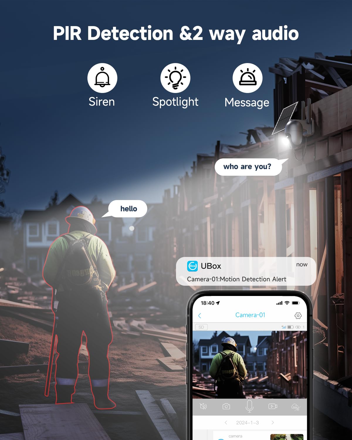 - 【PIR MOTION DETECTION&TWO-WAY AUDIO】PIR motion sensors enable the camera to accurately detect animals and humans, greatly reducing false alarms. Then immediately push the alarm notification to you via your cell phone. Built-in microphone and speaker allows for live calls, keep in touch with your family anytime, anywhere!
