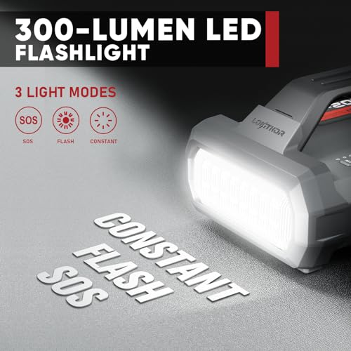 - 🚕【4-IN-1 Multi-Function】Not only a car battery booster, a Tire Pumper, but also a portable power bank, a LED flashlight. Support fast charging/USB 3.0, adapt smart phones, tablets and other USB devices. Input:5V/3A and 9V/2A, Output:5V/3A and 9V/2A. The integrated 300-lumen LED flashlight has 3 lighting modes, constant lighting, flash and SOS.