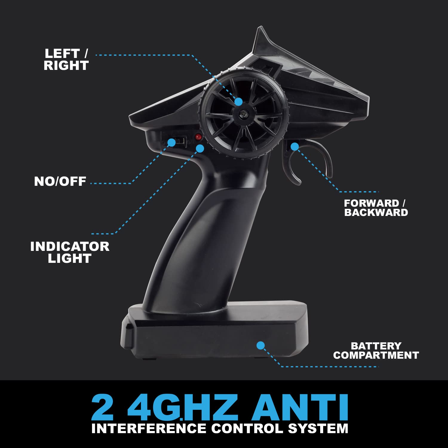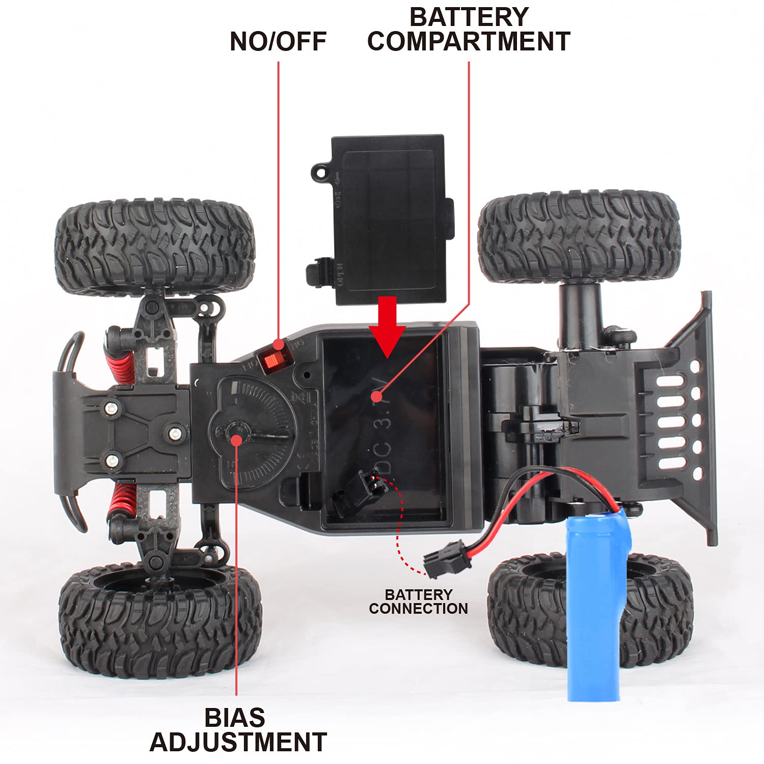 - 【PERFECT FOR BOTH SOLO and SOCIAL PLAY] Main function: forward/reverse/turn left/turn right. The control distance is about 50 meters, independent stable signal 2.4 Ghz with non-jamming function and anti-interference function which can support multiple cars playing at the same time. Equipped with 2 x 3.7V 500mAh rechargeable batteries; 2-3 hours charging time. The rc car controller need 2 x 1.5V AA batteries (excluded).