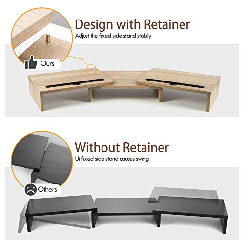 - Adjustable Computer Monitor Riser: Freely adjust the angle as you need. The length can be adjusted from the minimum 29.1 inch to the maximum 41.61 inch. Added retainers to the corner, the dual monitor stand can lock 2 side shelves from sliding out when you change angles and always keep monitor in place.