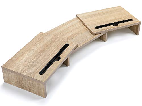 LORYERGO Dual Monitor Stand for Desk, Monitor Stand with 2 Slots for Phone and Tablet, Dual Monitor Riser with Length and Angle Adjustable, Computer Stand for Monitor, Laptop, Tablet (Light Wood)