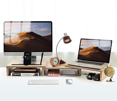- Sturdy Computer Stand: The thick panels of the dual monitor riser can load up to 44 lbs, perfect for a monitor, printer, laptop, gaming console, telephone, etc. The MDF material is much better than all kinds of particle boards, also is environmentally friendly.