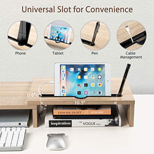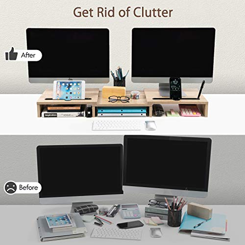 - Monitor Stand with 2 Slots: This Dual monitor riser raises your screen to create large storage space underneath, allowing you to place keyboards, calculators, notebooks, and other office accessories. 2 built-in slots design could hold tablet, cell phones and manage cables, pens, clips, and other office supplies.This dual monitor stand helps you to get rid of messy desk, and keep your working space tidy.