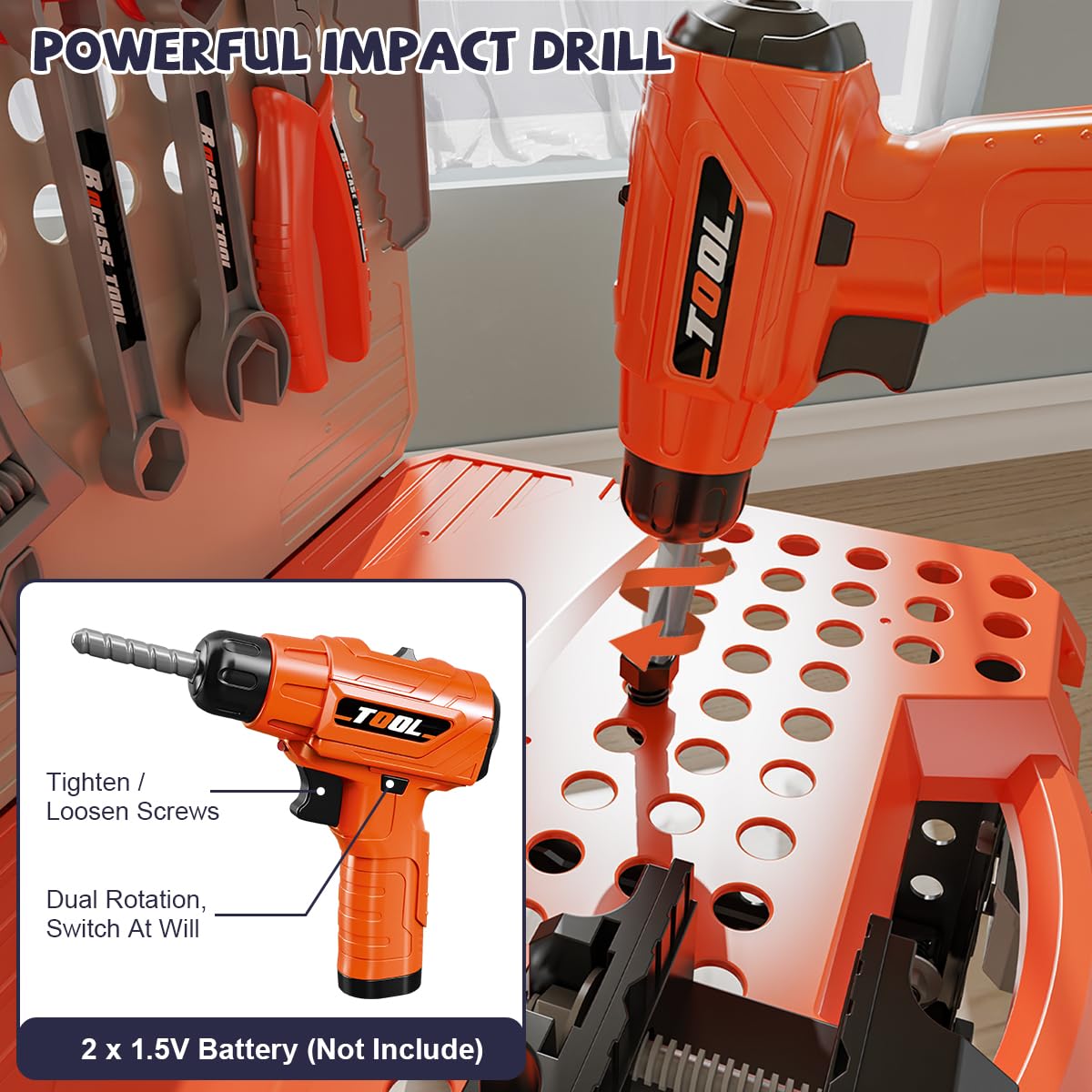 - FUNNY ELECTRIC DRILL - Equipped with 3 interchangeable bits that drill in both directions and emit sound and light like a real drill, making it ideal for night work. The tool bench is equipped with a shelf and storage tray, using hooks to hang tools or place them on the tray for quick and easy clean-up.