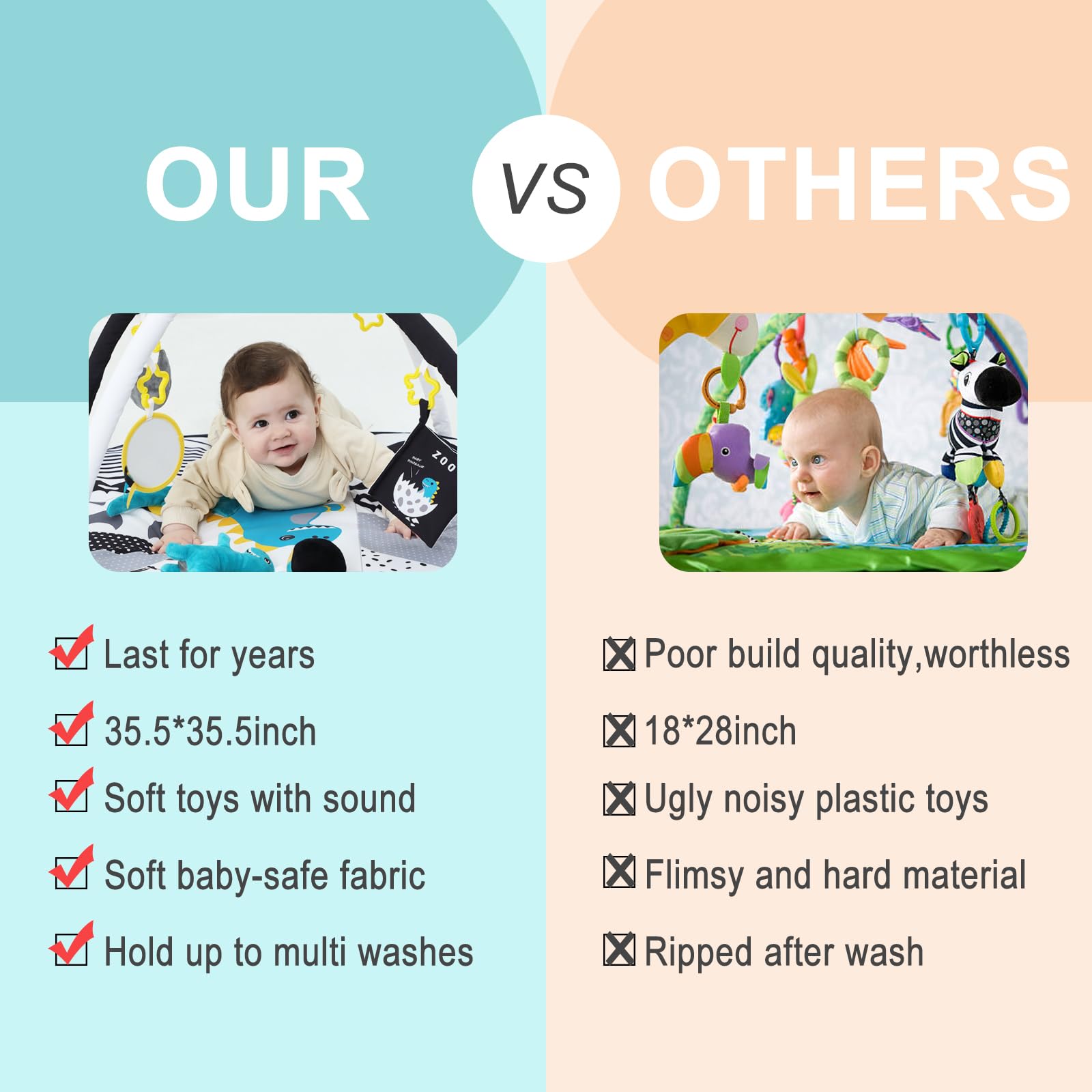 - Attractive High Contrast Baby Play Mat:As we all know, baby born with blurred vision, and gradually increased on 3 months. High contrast baby play mat and toys helps stimulate development in the retina and the optic nerve, to train step by step and activate the brain. This tummy time mat is equipped with 3 high contrast colors, 5 different toys, all of which will aid visual development in the early stages.Good ideal for infants and babies 0-6 months and up.