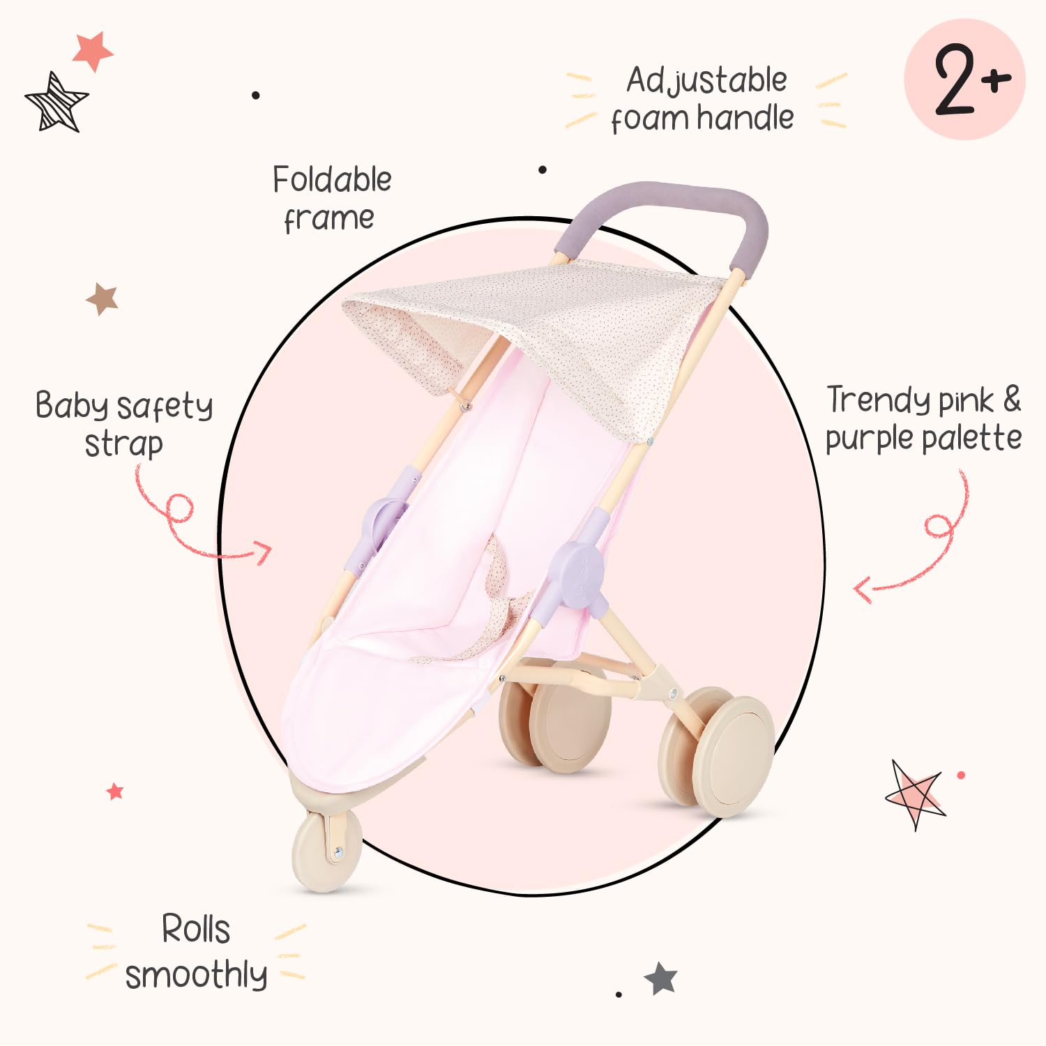 - Easy to Push & Play: Designed in a trendy pink and purple palette, the stroller has an easy-grip foam handle, a polka-dot canopy that opens and closes, and a safety strap to secure baby doll during travel time.