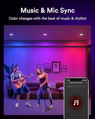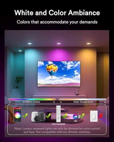- 【Brightness & RGBWW Adjustable】Lumary color-changing 4-inch recessed lights support warm white and cool white adjustment from 2700K to 6500K, 16 million RGB colors, and 1%-100% dimmable brightness to fit any mood or decor. Multi-preset scene modes and DIY scenes to fit any occasion.
