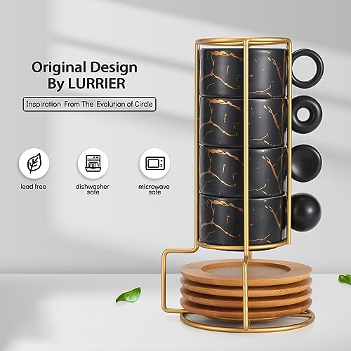 LURRIER Porcelain Espresso Cup with Saucer and Metal Stand, 3 Ounce Stackable Ceramic Demitasse Espresso Mugs Cups Set for Latte,Coffee,Cafe Mocha,Tea(Set of 4),Marbling Black