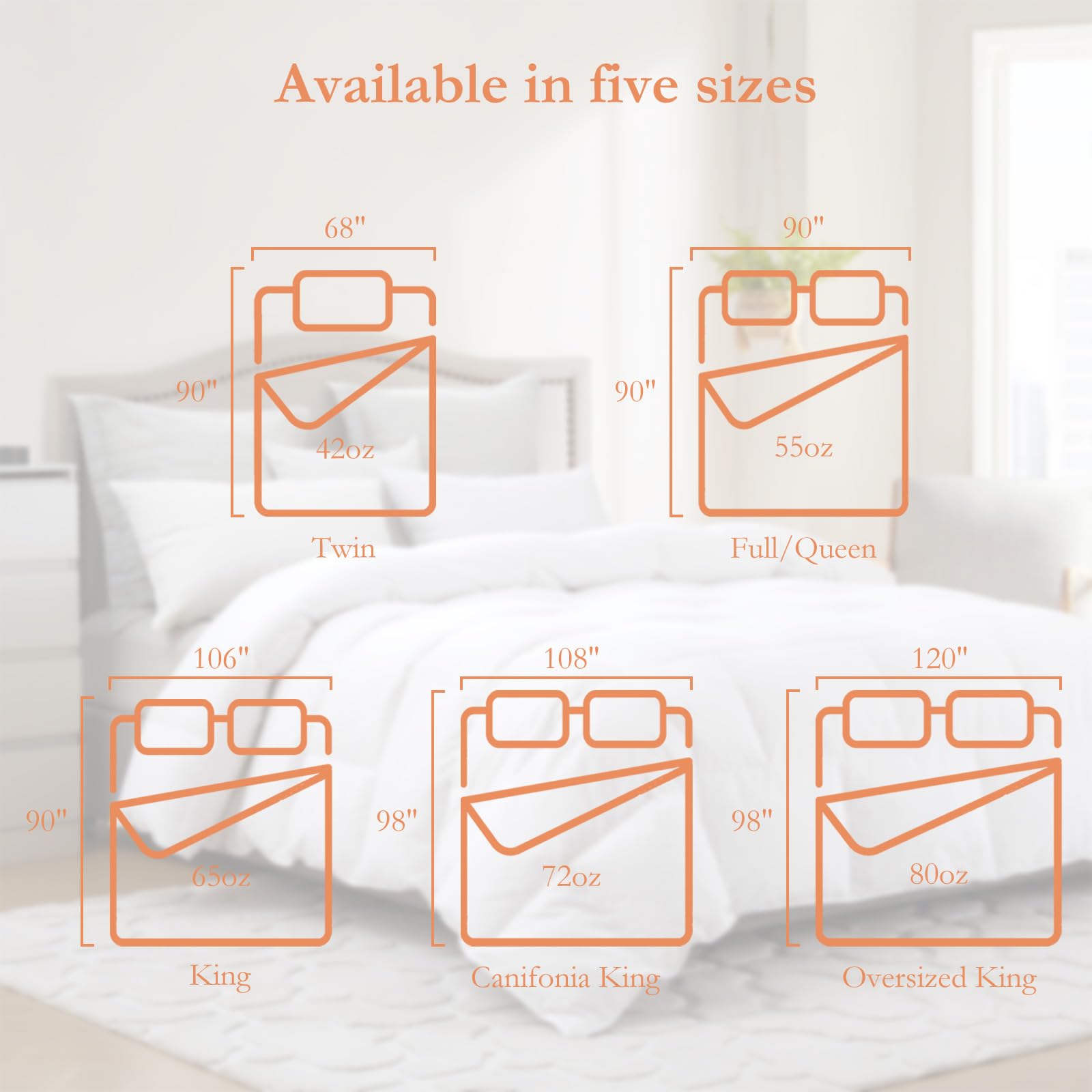 - QUEEN SIZE ALL SEASONS COMFORTER- 90"X90”inches.10%white goose down&90%feather makes this duvet feel soft and fluffy - like a huge marshmallow. The premium filling will draw away heat and moisture from your body as you sleep, so you'll wake feeling fresh as a daisy.