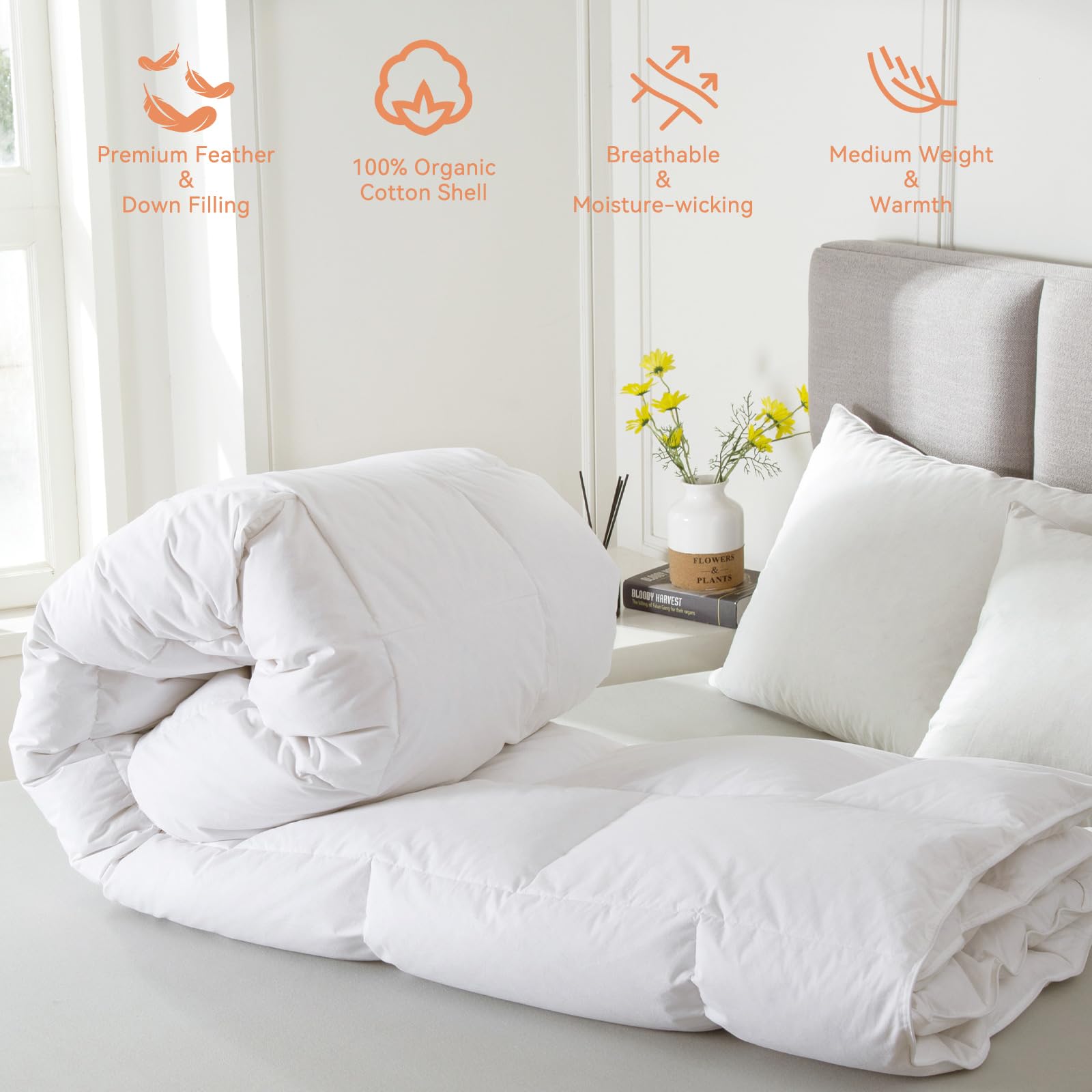 Luxury Queen Size White Goose Feather Down Comforter, All Seasons Duvet Insert 600 Thread Count Soft 100% Organic Cotton Cover Down Proof,Medium Warmth Cozy Duvet with 8 Corner Tabs.