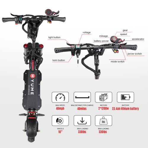- [YUME Y10 offers outstanding speed and range]: The Y10 electric scooter comes equipped with two independent drive motors offering up to 2400W of power, hydraulic brakes and a 52V 23.4AH lithium battery. It delivers fast speeds up to 40mph with a range of 40 miles. The multi-functional display and throttle allows you how to easily change gears and speed with 3 speed modes, 2 power modes and dual motor control.