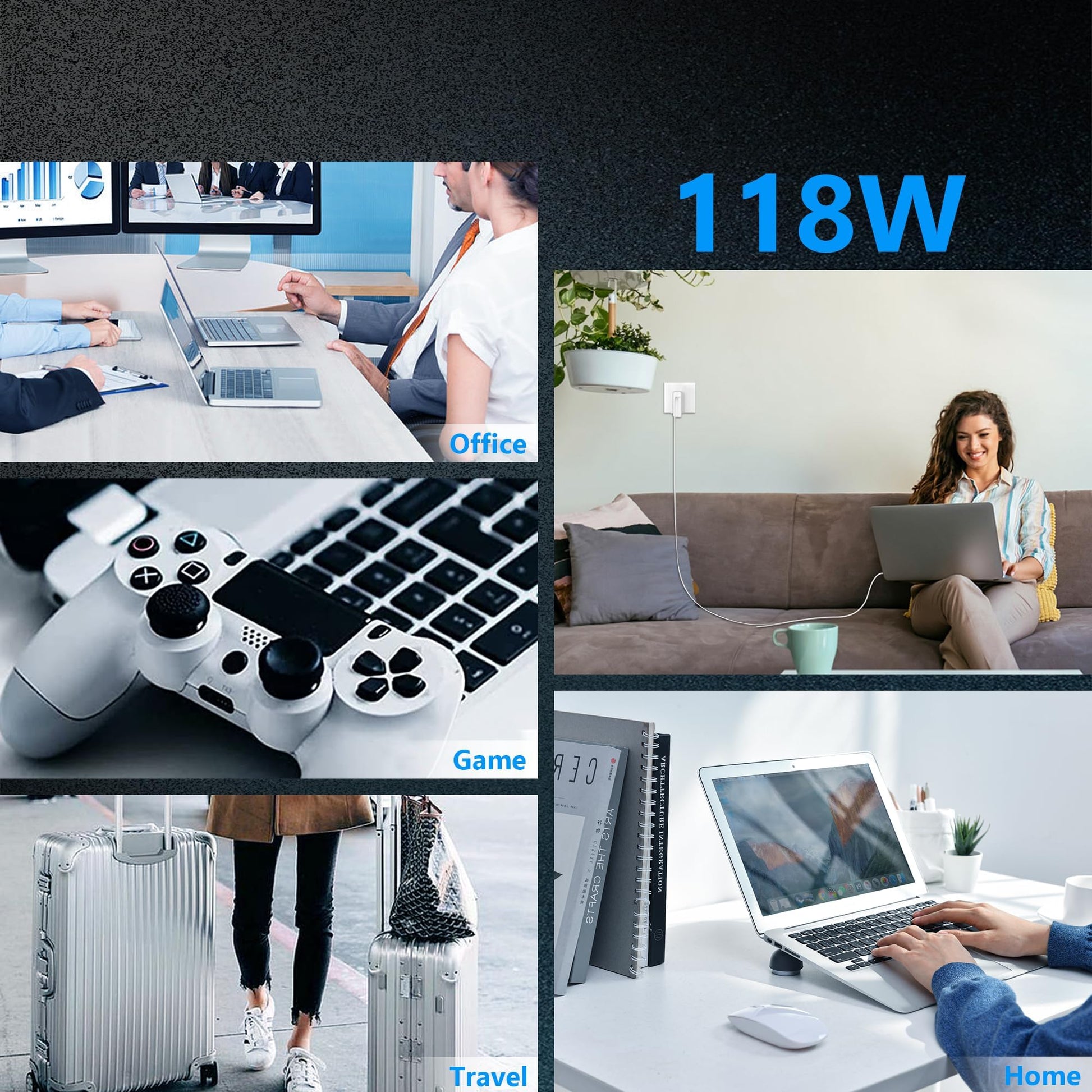 - 【What You Get】1*118W USB-C Laptop Charger + 1*6.6ft C-C Fast Charge Cable + 1*Velvet Storage Bag