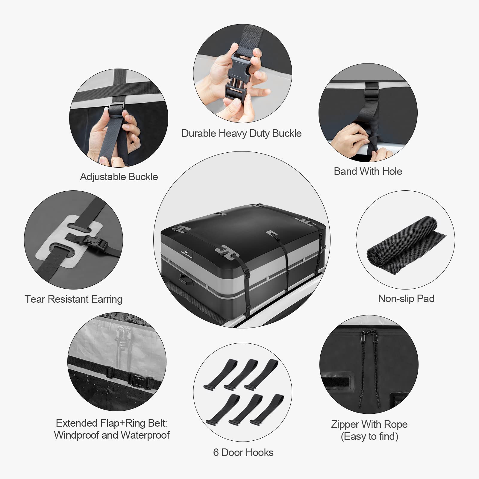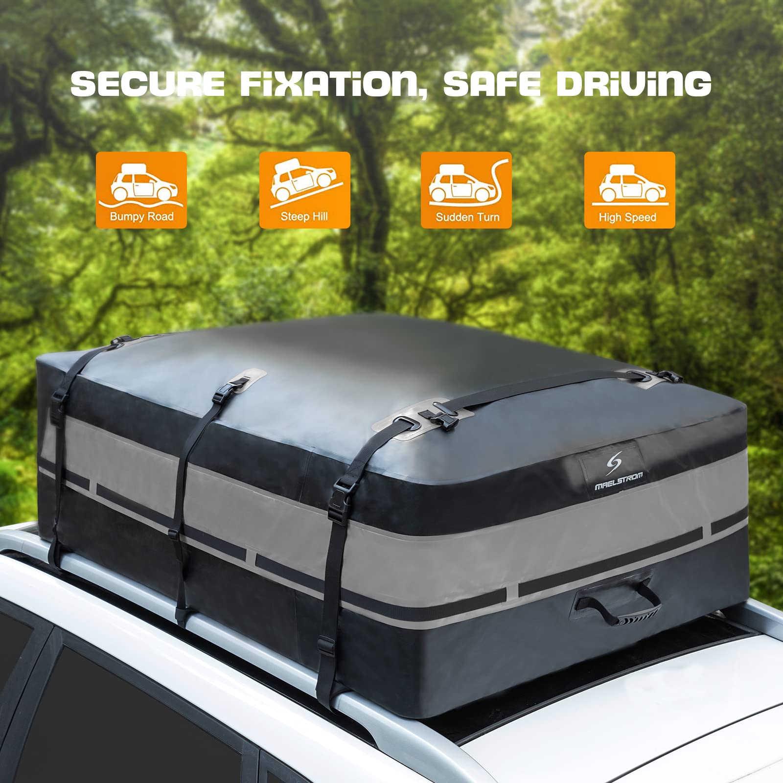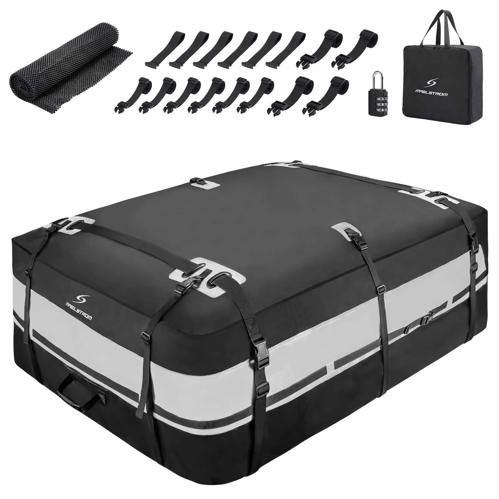 - LARGE CAPACITY: 21 cubic feet Maelstrom roof rack cargo carrier ( 53.15”x 40.55”x 16.93”) is designed to solve the problem of limited storage space in the car. This vehicle cargo carrier allows you to hold 4-6 suitcases,tents, sleeping bags and so on. This car roof bag comes with 1 non-slip mat,10 buckle straps, 6 door hooks,1 lock and 1 storage bag.