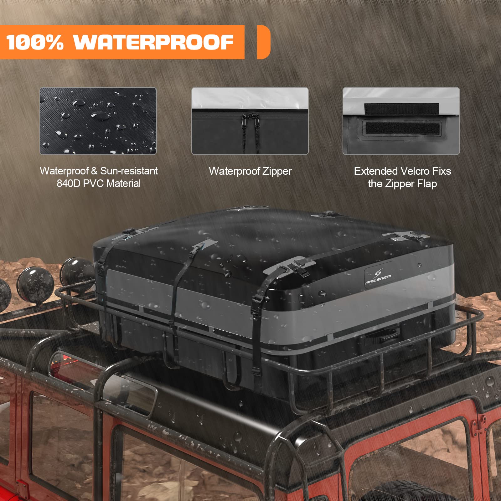 - 840D HIGH QUALITY MATERIAL: Made of wear-resistant, waterproof and sunscreen 840D PVC fabric.Maelstrom rooftop cargo carrier can protect your items from any damage and wetness in extreme weather like rainstorm.