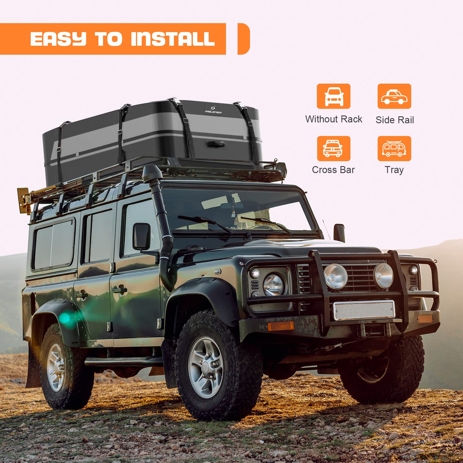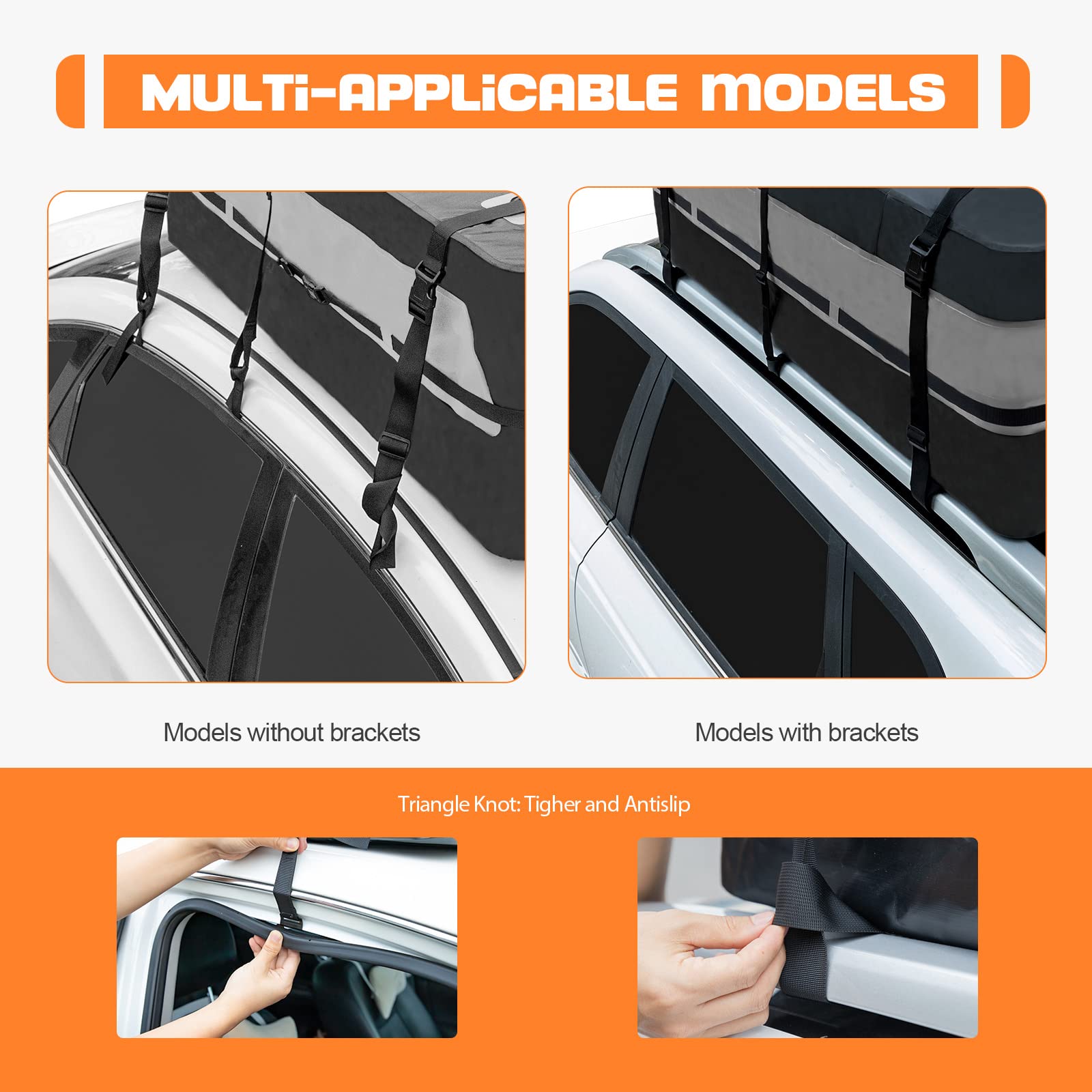 - UNIVERSAL COMPATIBILITY: Maelstrom soft car roof top carrier suits for cars and SUV of any sizes, and work both car with or without roof rack.Installed in minutes easily whether there is a rack on car or not. To fix the cargo box for car rooftop,you can tie the straps on the sided crossbars/rails/roof rack/basket directly,or use the included 6 door hook straps to attach under the door's rubber seal gasket.