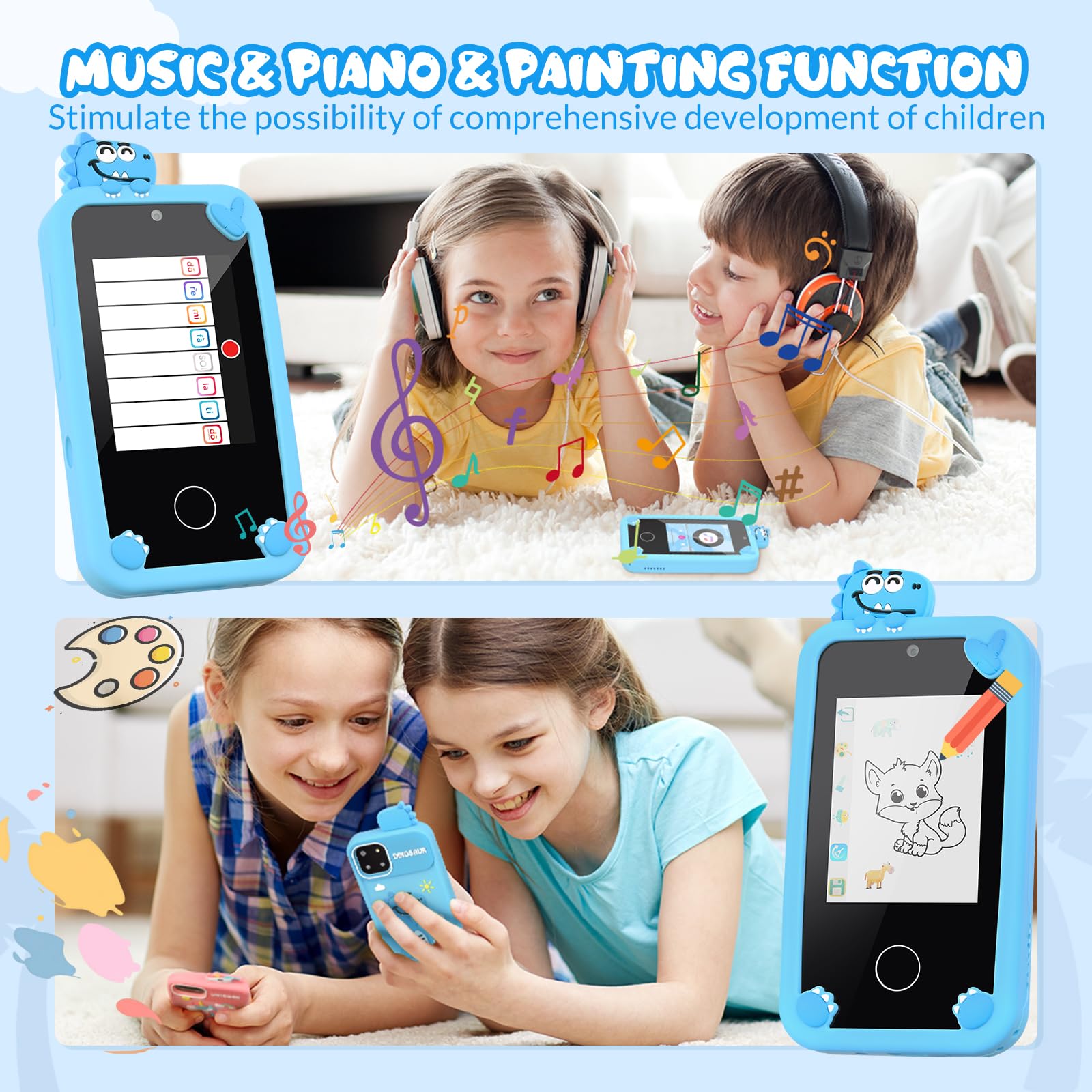- [Fun and Educational Kids Phone Toy] With a 2.8 inch screen, this kids smart phone offers hours of fun and learning for your child. They can learn the alphabet, fruits, and animals while playing games that enhance their cognitive skills. The piano and drawing functions encourage creativity, while listening to English and reading stories helps improve language skills. Plus, it comes with practical tools like a calendar, timer, alarm clock, calculator, and flashlight. Give your child the gift of education and entertainment with this amazing toy.