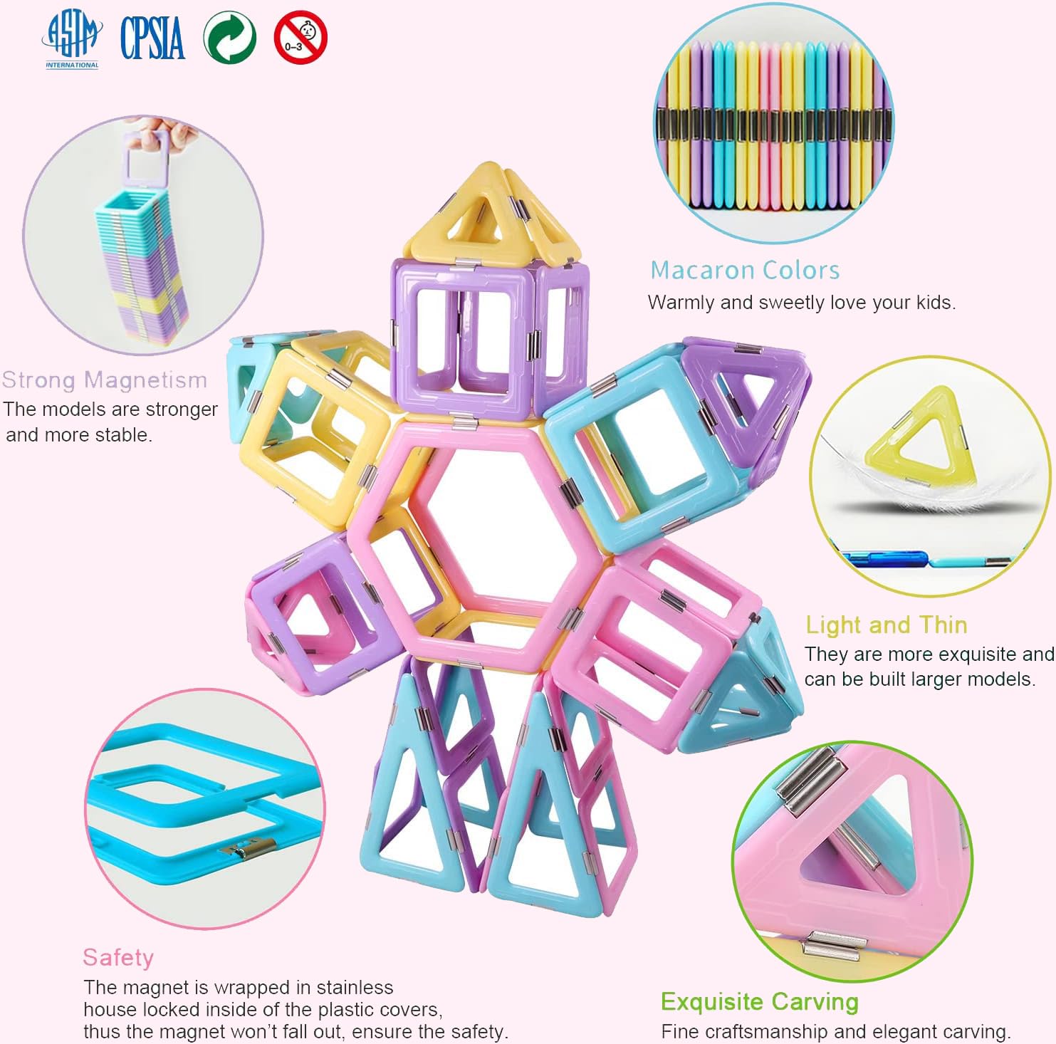 - 【Ideal Gift for Girls】Surprise the little ones in your life with this fun and educational magnetic tile set. Whether for birthdays, holidays, or any special occasion, this magnet tiles set is a perfect gift for kids aged 3+. Can be displayed at a party, craft project, camp, family fun day, creativity activity in the classroom, car, train, plane and outdoors for a fun day. Foster learning and fun with this engaging building toy!