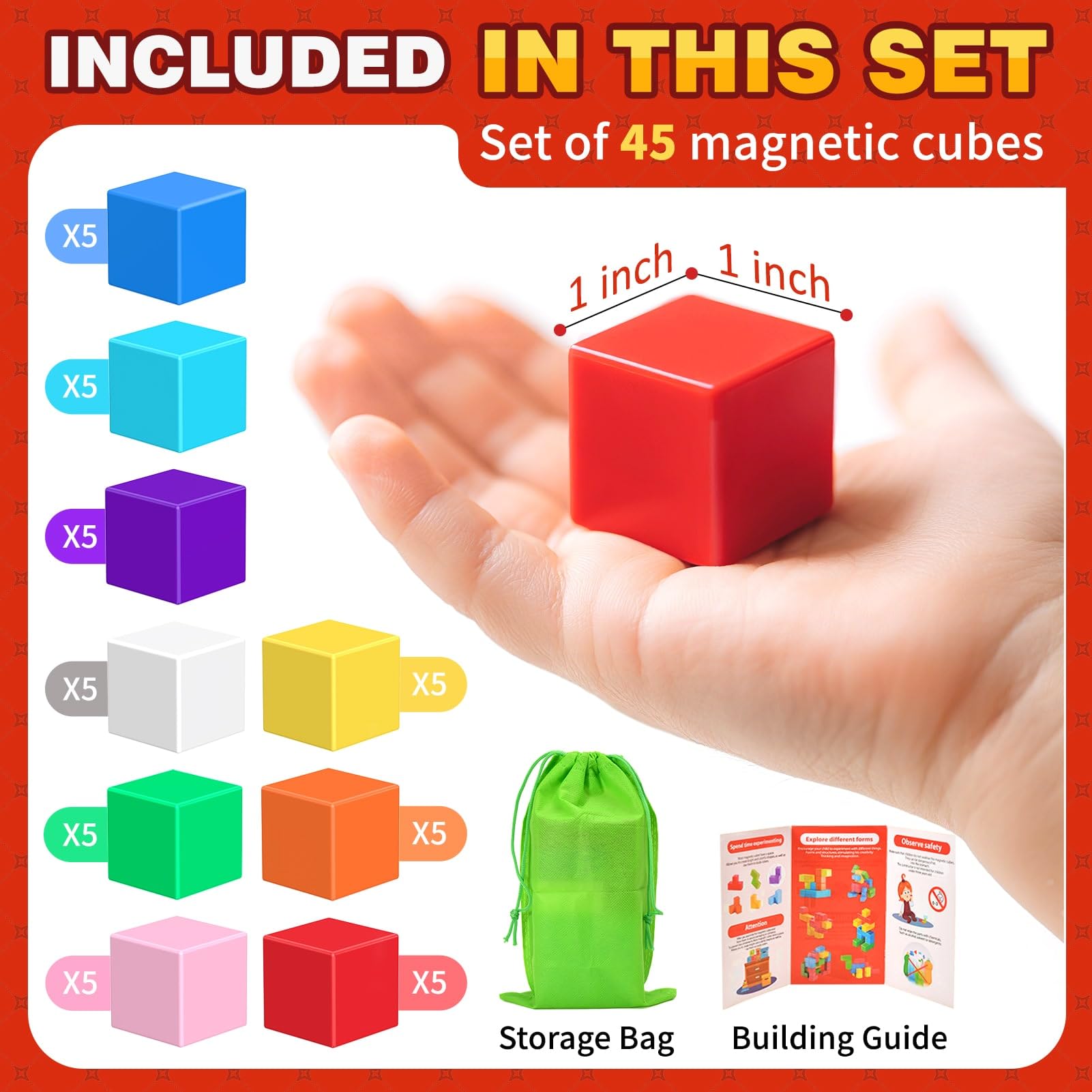 - 45PCS MAGNETIC BUILDING BLOCKS IN 9 EYE-CATCHING COLORS - Unlock endless creativity with our 45-piece Magnetic Cube Set, available in 9 striking colors. Perfect for boys and girls aged 3+, these vibrant blocks inspire imaginative play and unique creations, allowing young builders to bring their ideas to life.