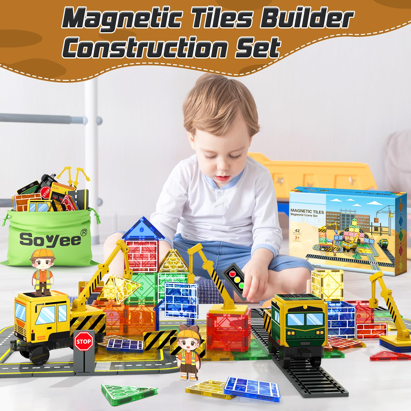 - 【QUALITY YOU CAN TRUST】 SOYEE magnet toys are made of ABS material and use stronger magnets. The set contains rich elements such as cranes, engineering vehicles, roads, trains, rails, stations, traffic lights, enclosures, and magnetic figures. The crane magnetic tile can be rotated and telescopic, which is extremely operational