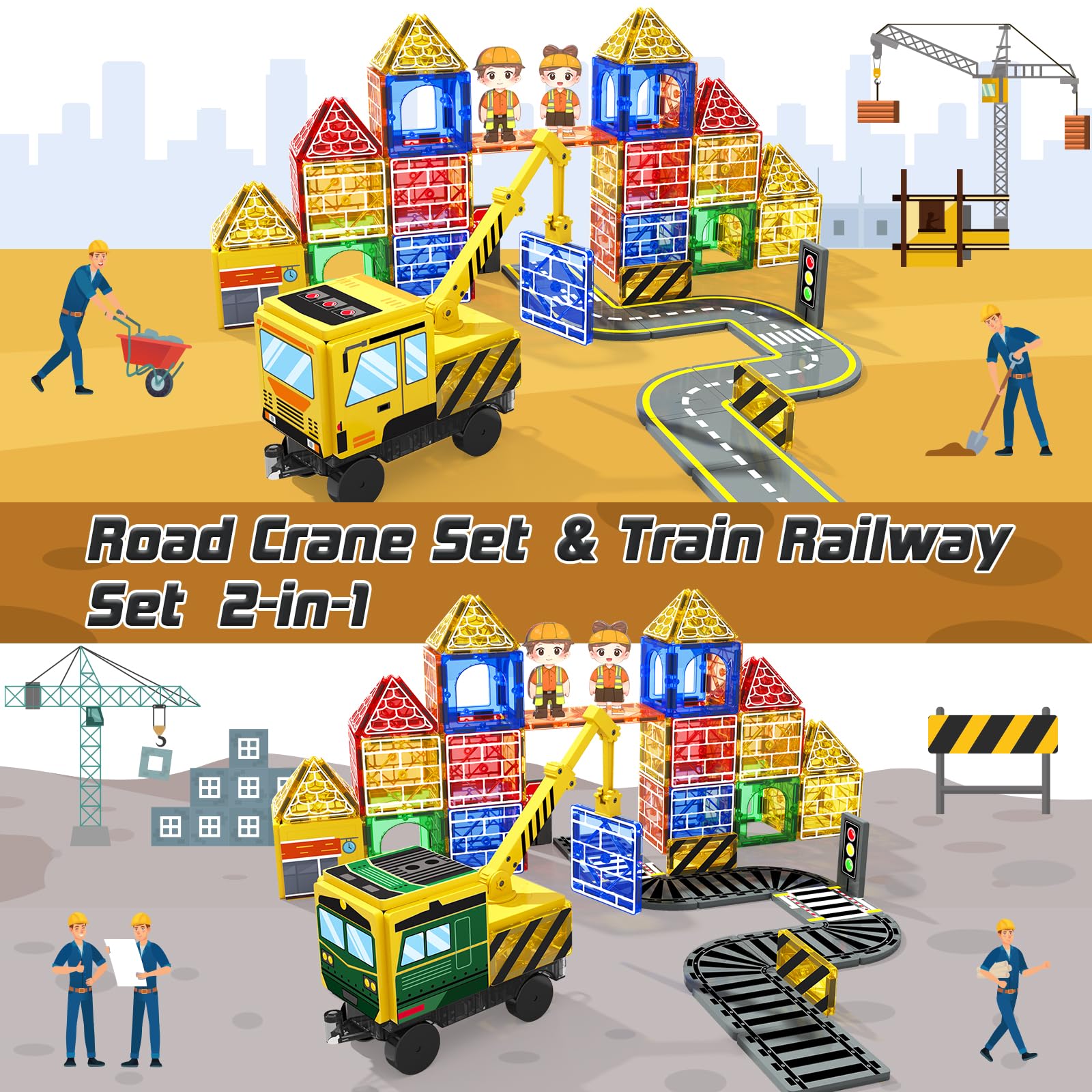 - 【TWO THEMES MAKE REGULAR MAGNETIC TILES SPECIAL】 Features extendable magnetic Cranes and popular Road and Railway pieces igniting kids' imaginations. Regular magnetic blocks can be transformed into special scenes, such as house construction sites, station construction sites, train rescue scenes, road rescue scenes...Kids can explore their imaginations as they create a variety of interesting and exciting construction tasks and rescue missions