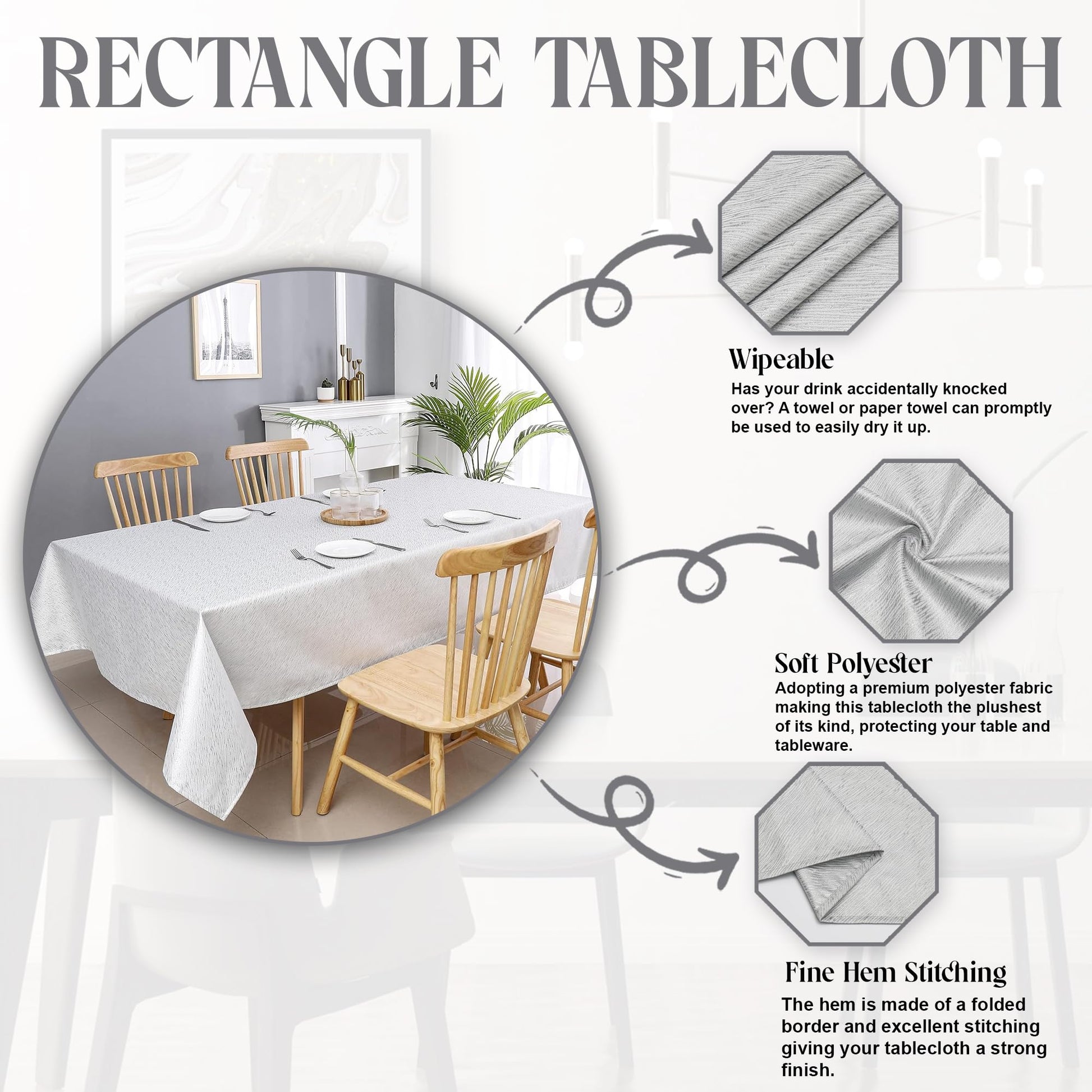 - POLYESTER'S LUXURIOUS TOUCH: Crafted from top-quality polyester, this rectangle tablecloth features a material known for its exceptional softness and smoothness. You'll experience a luxurious and exquisite tactile sensation when you run your fingers across it. The high-quality polyester fabric used in this dining table cover enhances its overall elegance and tactile appeal.