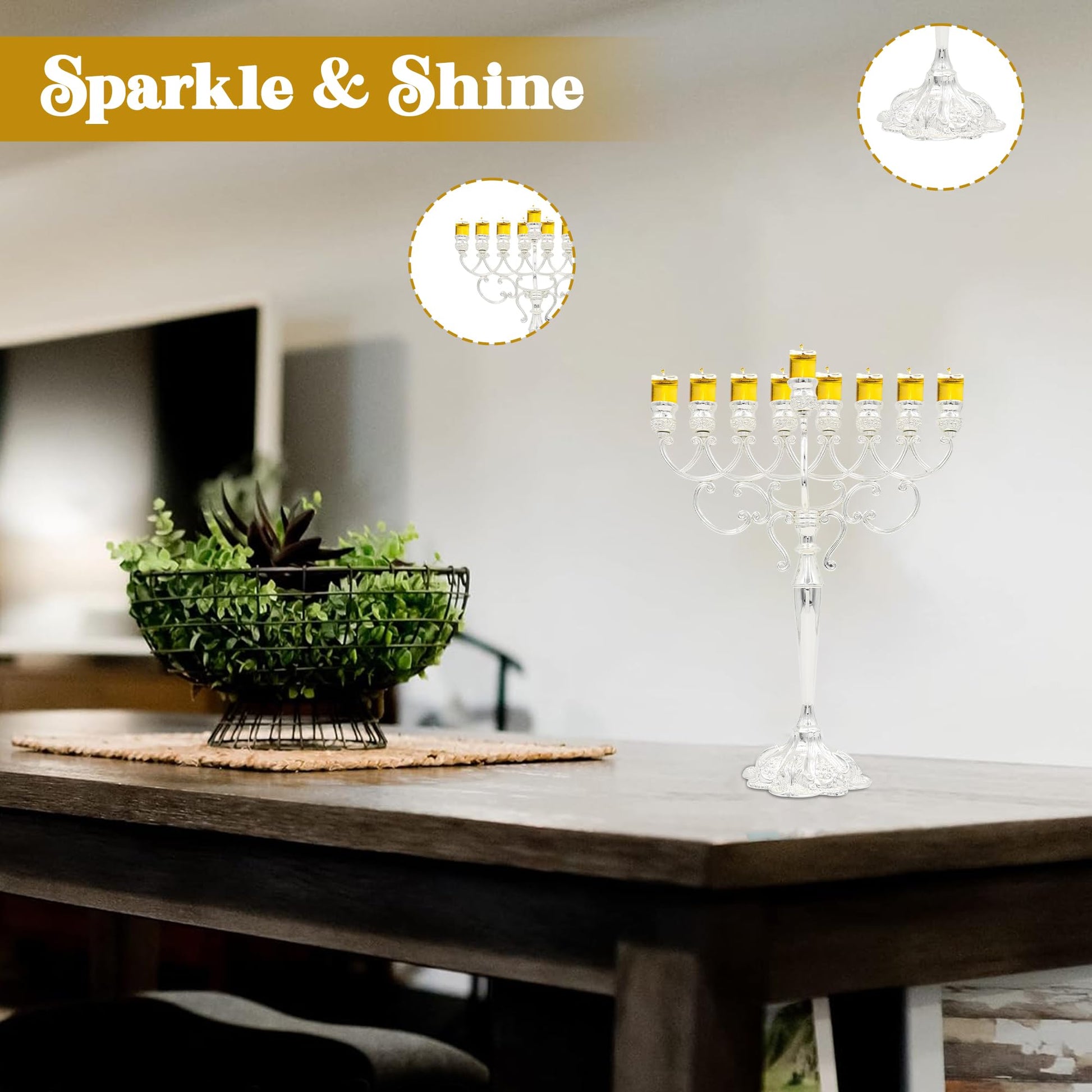 - π PREMIUM MATERIALS: Our menorah candle holders are carefully crafted using top-notch materials and superior construction. These menorahs for Chanukah stand tall and strong, ensuring the Menorah experience is safe and hassle-free. They securely hold candles or glass cups, making the Menorah centerpiece reliable and dependable.