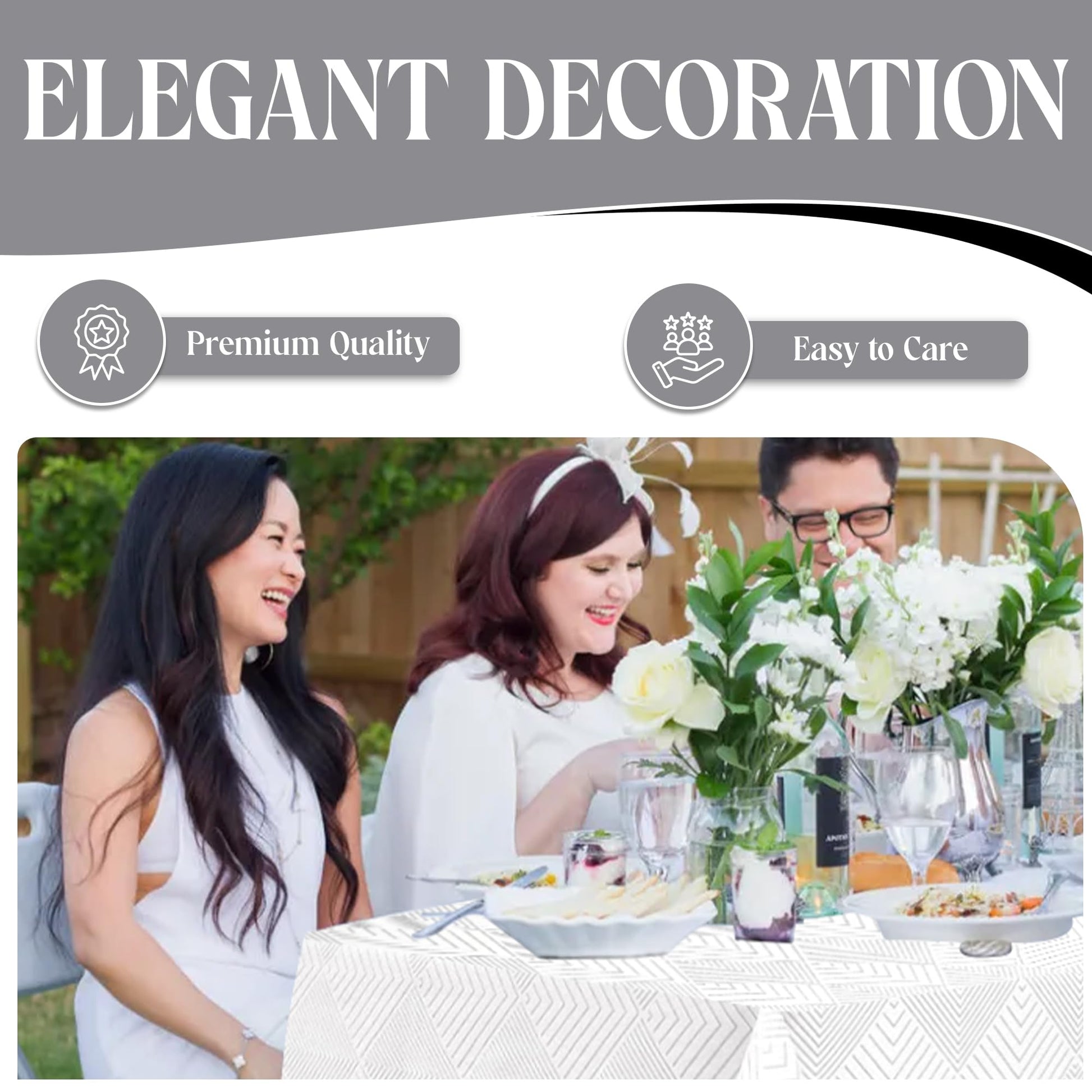 - PACKAGE INCLUDES: This large tablecloth comes in a versatile size, measuring 70 inches by 144 inches. It features an attractive silver geometric print that combines the classic colors of white and silver. This color scheme adds an elegant touch to your table decor, making it suitable for various occasions and settings.