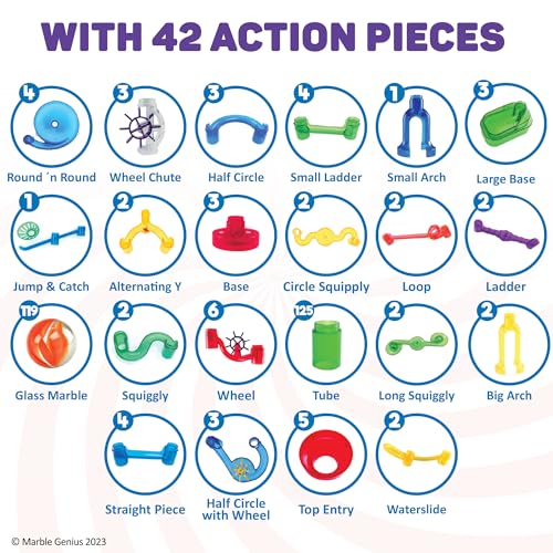Details: This vibrant Marble Run comes with 125 translucent pieces that allow you to see the marble action from top to bottom as the 20 glass marbles make their way down the set. The solid plastic pieces allow for easy use by young kids and adults. Marble Runs allow for almost infinite possibilities for assembly from the very simple to the extremely complex. This Marble Run Starter Set is the perfect way to allow you to start discovering the endless possibilities and excitement that comes from designing a run and watching the marbles make their way down the set.